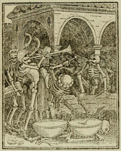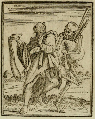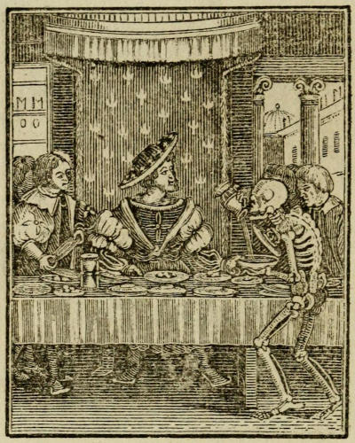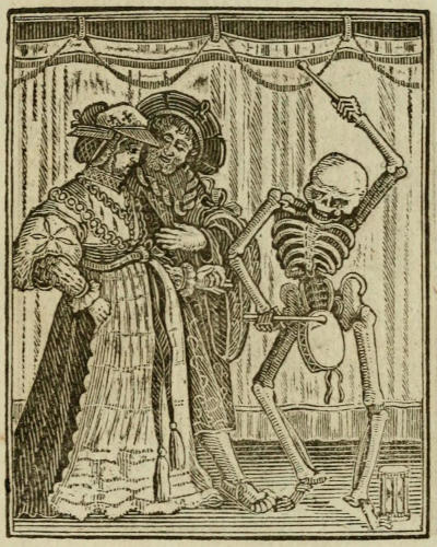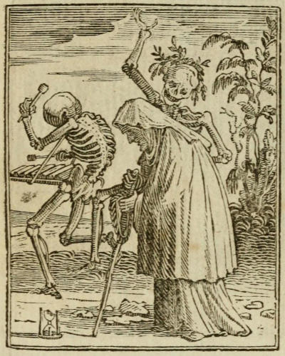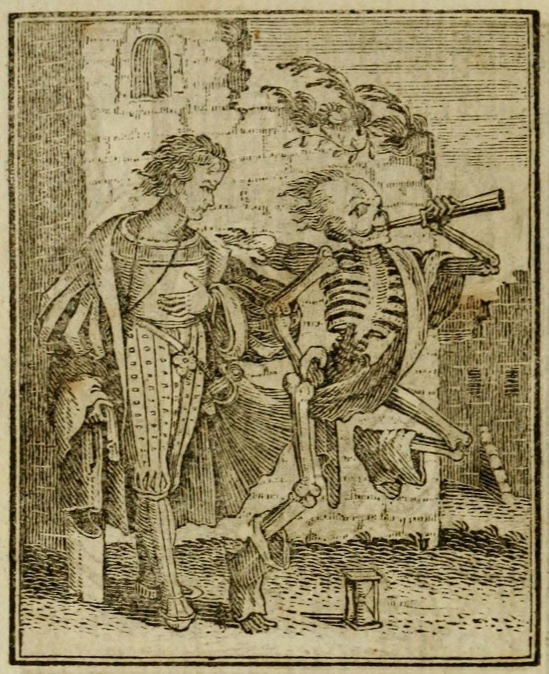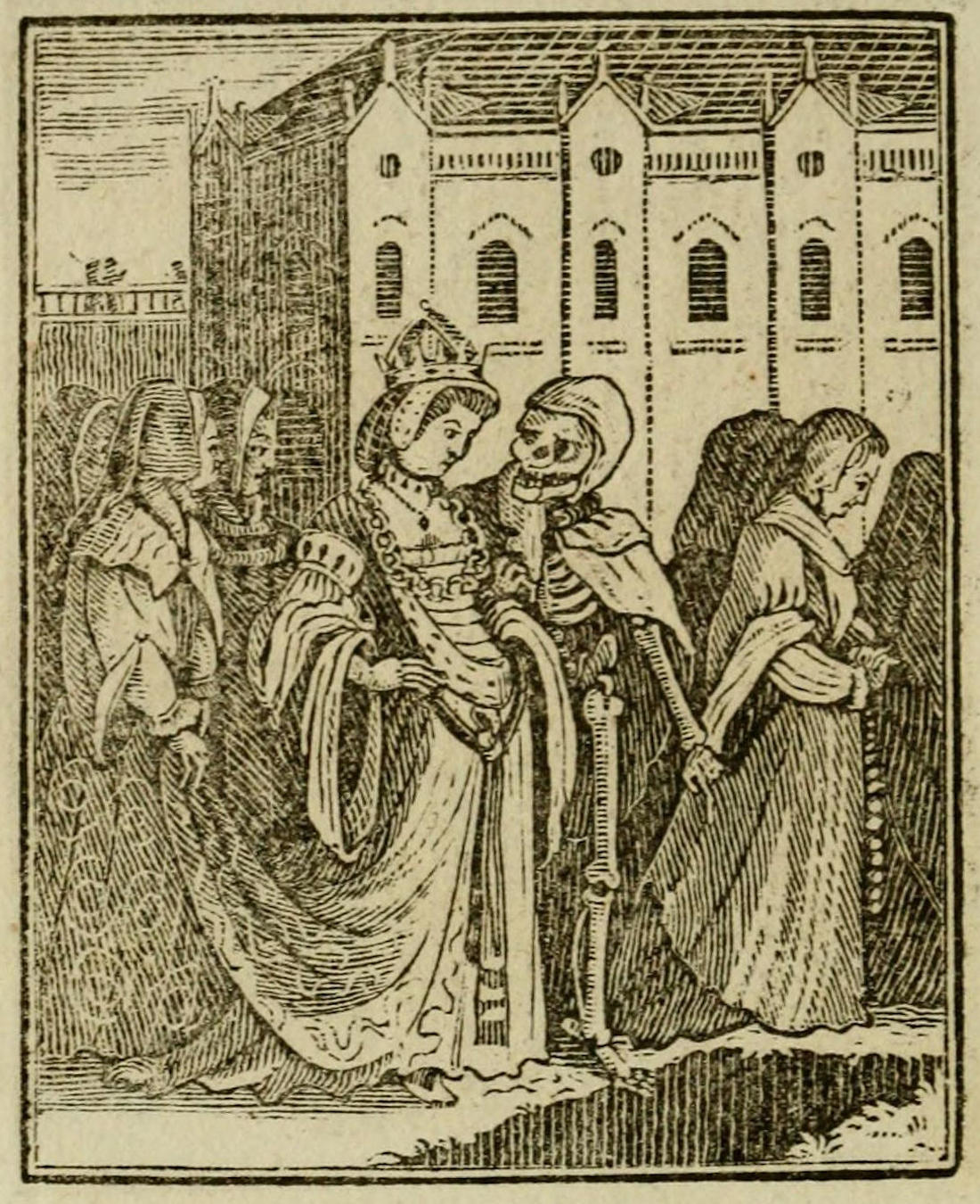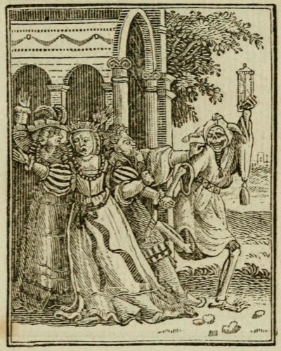 The same Inclination in Favour of this Subject began also, very soon after the Painting in Question was known, to discover itself in literary Publications, and in the Decorations and Ornaments of Books. One Macaber, a French or German Poet, but of what Æra is uncertain, wrote in German a Poem on the Subject of Death’s Dance, which, in Consequence of this Circumstance, is not seldom from him called The Dance of Macaber[11].[xi] His Verses were translated into French, and written round the Cloister of St. Innocent’s, at Paris, under, as I conceive, the before-mentioned Painting; and from this French Translation, Lydgate, at the Request of the Dean and Chapter of St. Paul’s[12], made a Version, which was afterwards inscribed on the Walls of their Church, under the Painting of the same Subject.