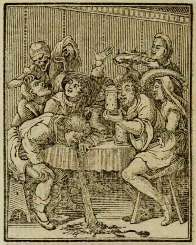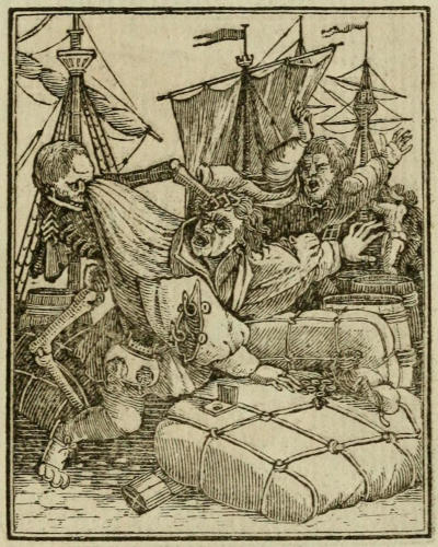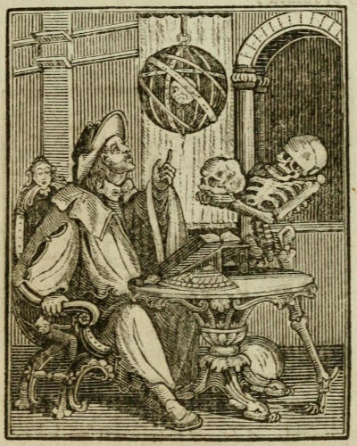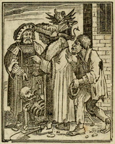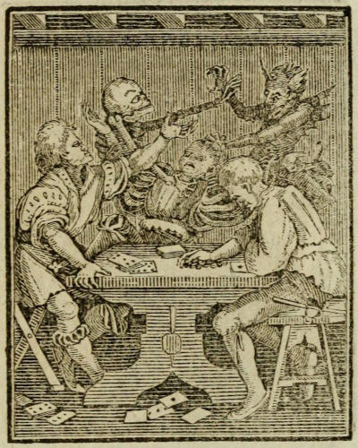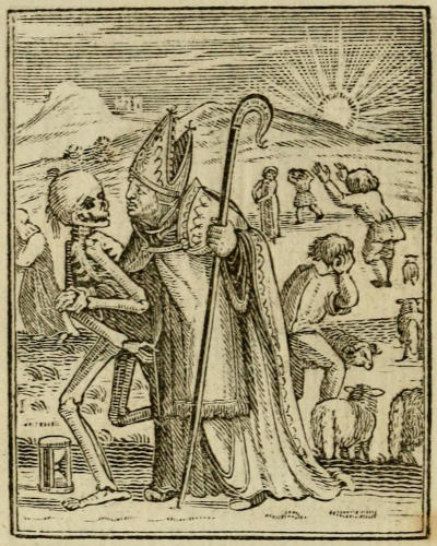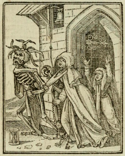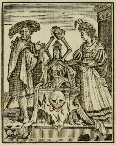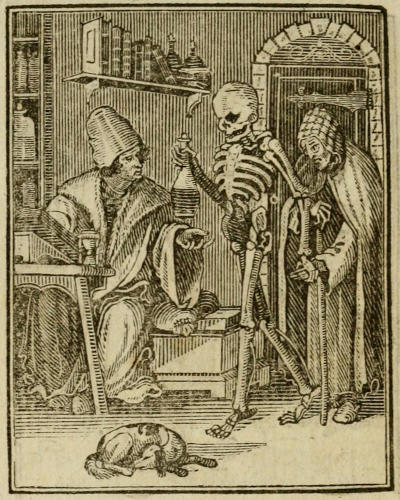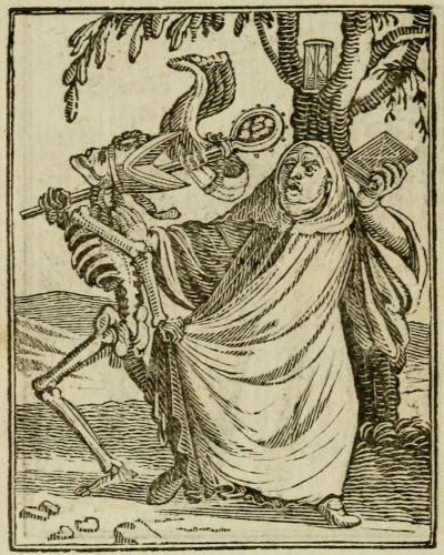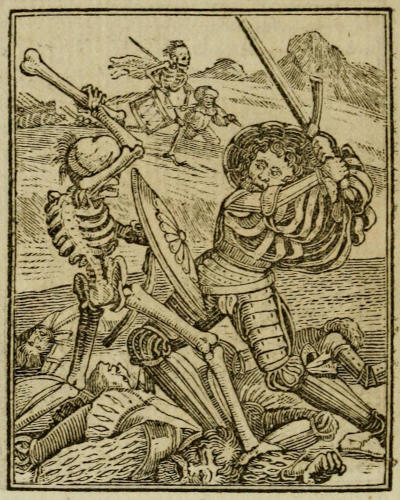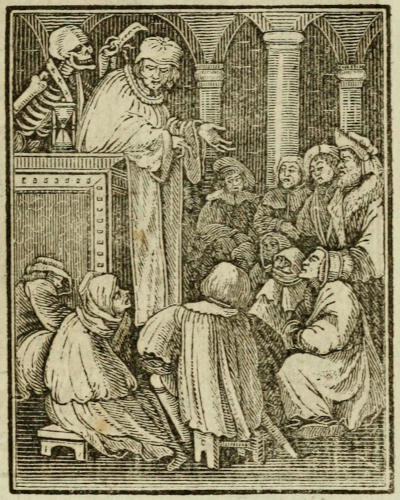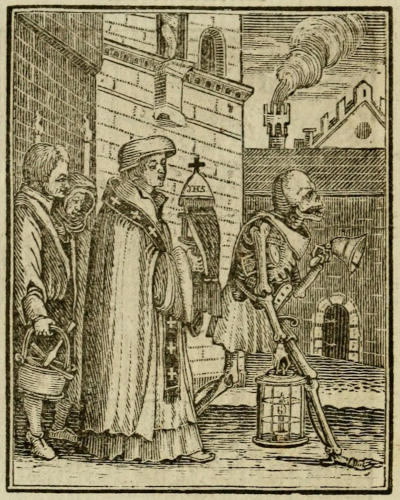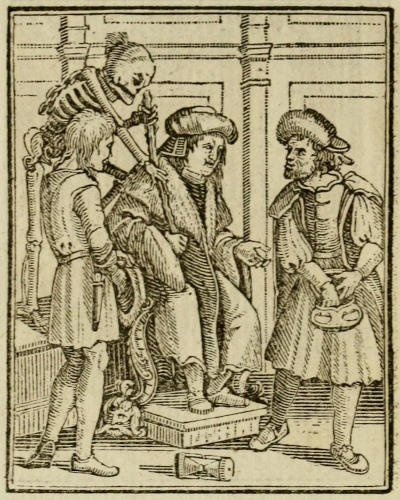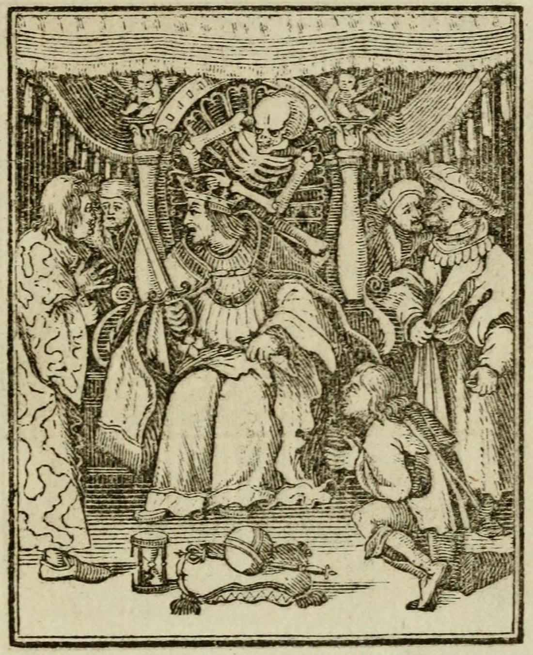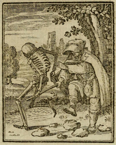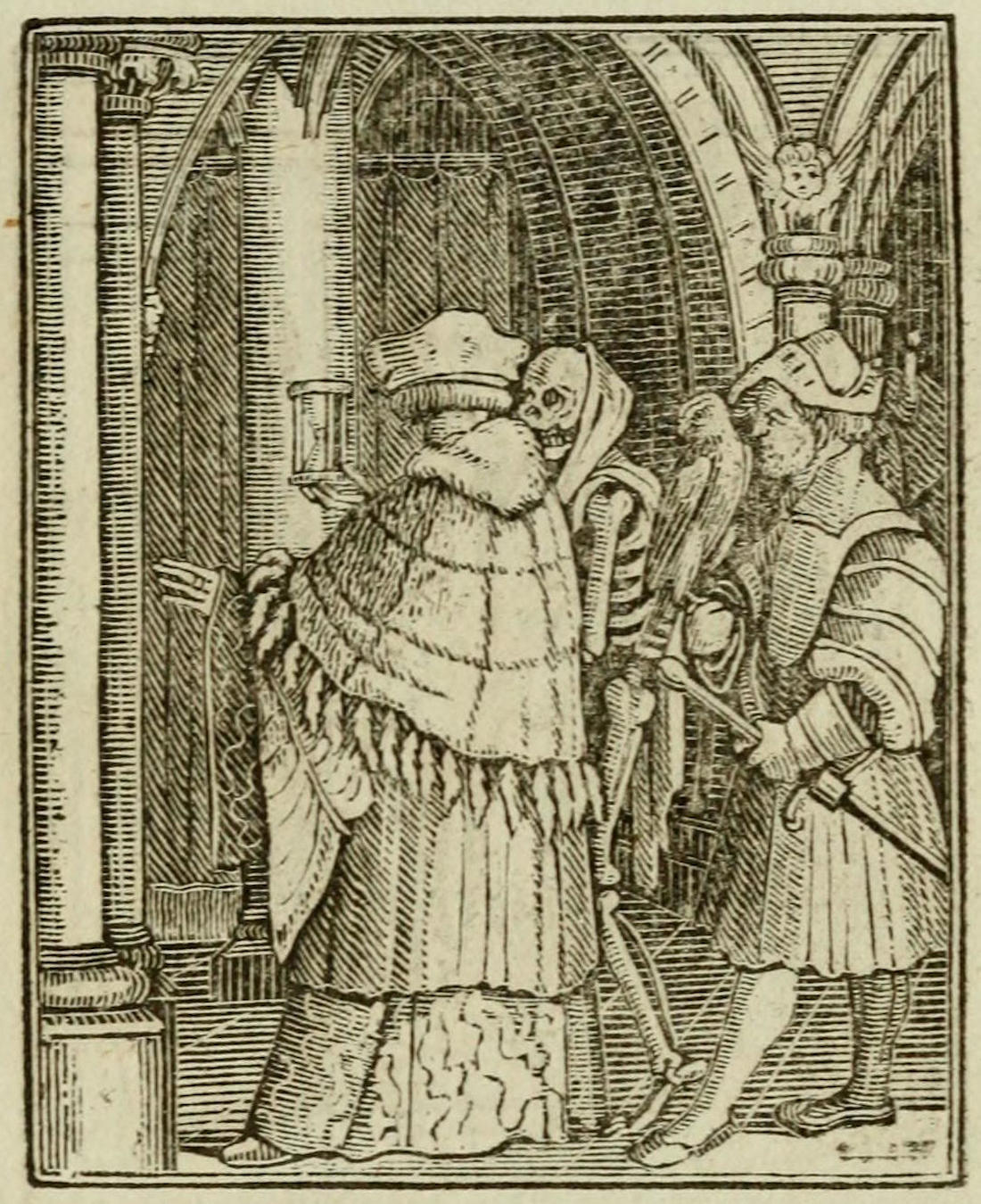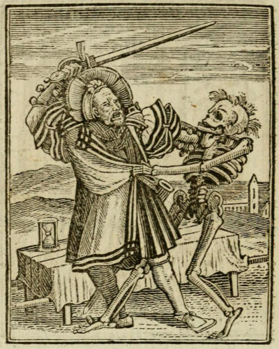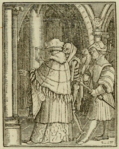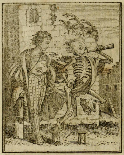 It would be an endless Task, and afford but little Entertainment to the Reader, to reckon up here a long List of Books in which the Subject has been reiterated: We shall therefore content ourselves with mentioning that it appeared in the Chronicle of Hartmannus Schedelius, printed at Nuremberg in 1493, Folio[13], usually called the Nuremberg Chronicle; in the Quotidian Offices of the Church, printed at Paris, 1515, in 8vo[14]; in several Horæ, Missals, &c. and even so late as in A Book of Christian Prayers, collected out of the ancient Writers and best learned of our Time, first printed in 4to. 1569, and afterwards in the same Size in 1608; and that, in Addition to all these and others which might be mentioned, the Painting at Basil was the Cause of the Publication of the Imagines Mortis, from which the present is copied and translated, and of which therefore it will be necessary here to give an Account; first observing, that the Excellence of the Cuts in the Original, which are here also copied with sufficient Fidelity, has induced an Opinion that they were the Work of Holbein, a Fact which we mean hereafter to inquire into.