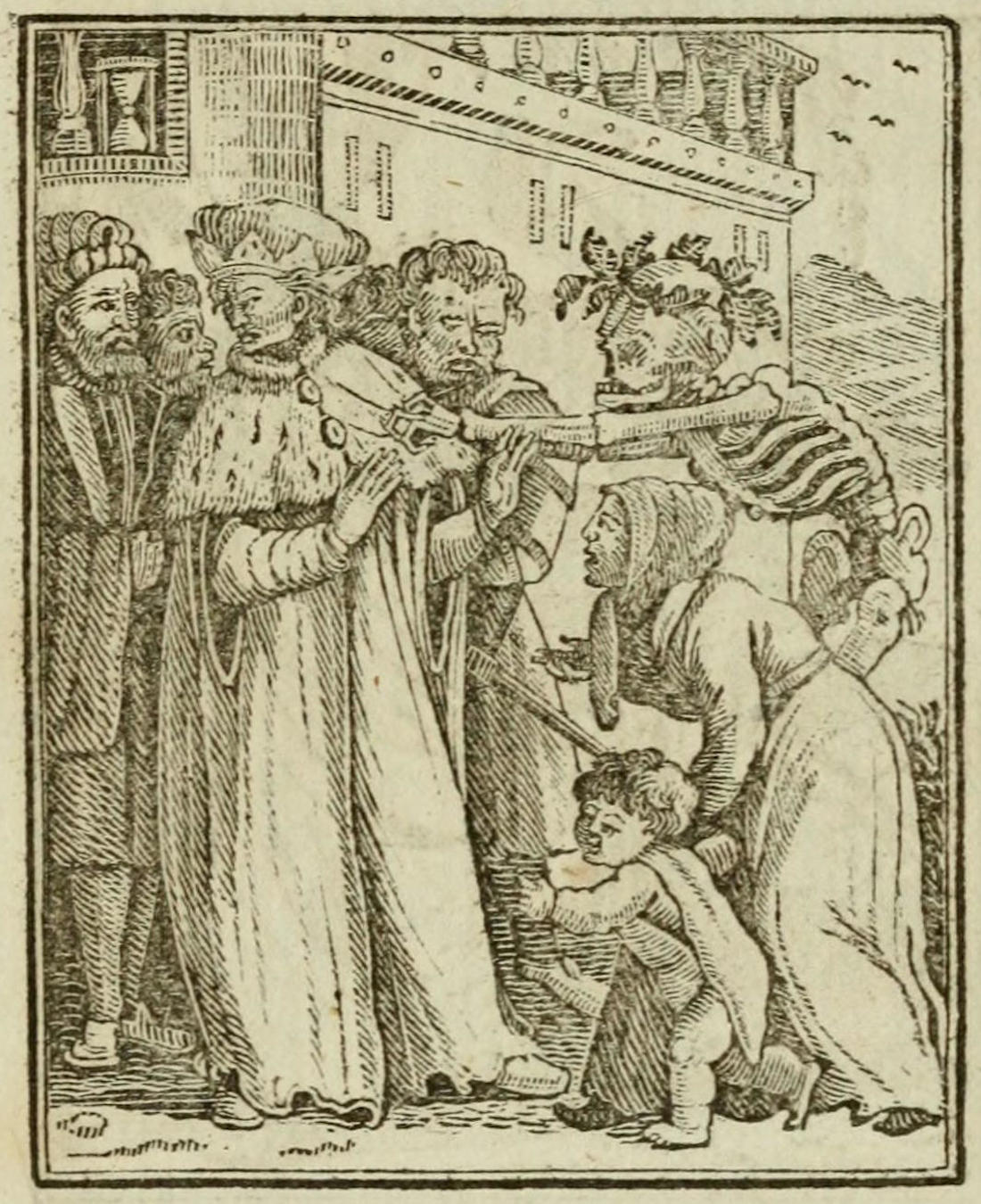 Papillon, in his Traité historique et pratique de la Gravure en Bois, 8vo. 1766, Tom. I. P. 166,[xiii] informs us, that Holbein, having arrived to a great Degree of Perfection in Painting, was employed by a Magistrate of Basil to paint a Dance of Death in the Fish-Market of that City, near a Cemetery (by which he undoubtedly means the Painting at Basil, of which we have so often had Occasion to speak); that this Work added much to his Reputation; after which he employed his Skill in reducing the original Figures into a small Size; and that he afterwards engraved them upon Wood, with a Delicacy and Beauty not to be equalled. But unfortunately Papillon here speaks without sufficient Attention; for the Painting at Basil, as may be learnt from Merian’s Engravings before mentioned, and on the Accuracy of which I am assured by an ingenious Friend, who lately examined them with the Originals, I may rely, consists of single Figures, each led by a Figure of Death, and following each other in order, so as to form a long Procession: The same may be remarked of the Painting at St. Paul’s; and, for aught that appears to the contrary, of that at Lubec, and of that at St. Innocent’s Church at Paris, and probably of all the others which we have noticed above: Whereas the present Cuts consist of separate Compartments, each containing Groupes of Figures, so that the present Work is by no means merely a Reduction in Size of the Painting at Basil, but is rather to be considered as founded on[xiv] the same Idea, and suggested by the Original, than as a Copy from it.