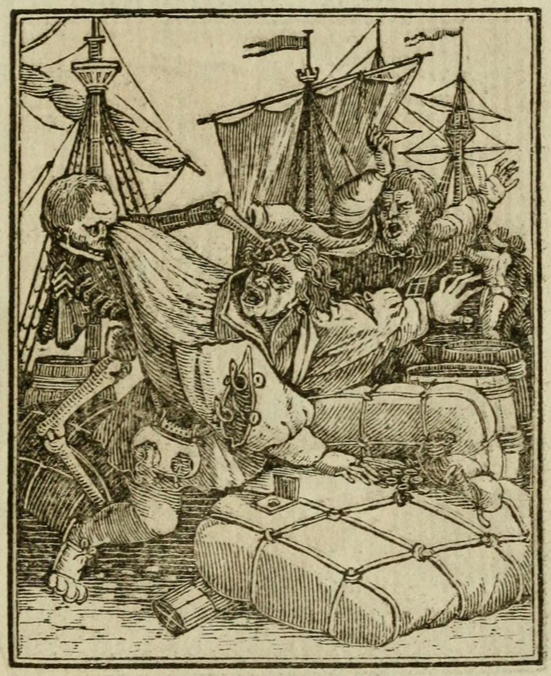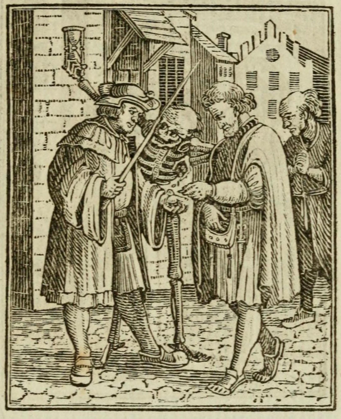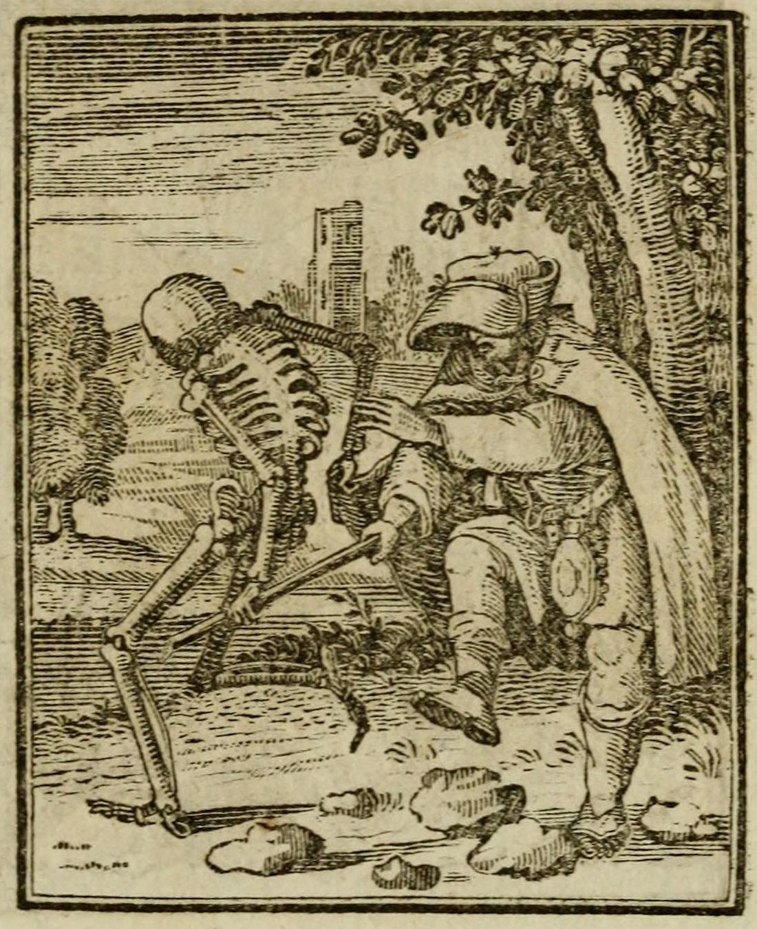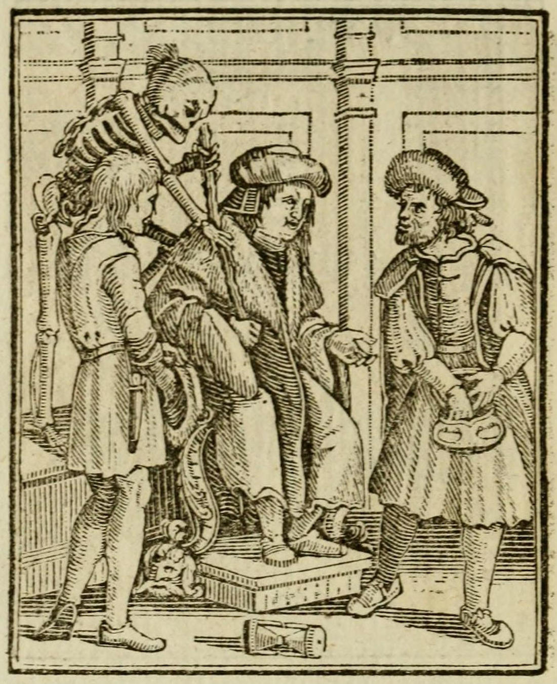 Nicolas Borbonius, a Poet contemporary with Holbein, has addressed to him an Epigram “De Morte picta, a Hanso Pictore nobili[18],” from which it is inferred that he painted a Dance of Death; and Sandrart relates that in the Year 1627, in a Conversation with Rubens, at which he was present, the Imagines Mortis was stiled Holbein’s, as will appear from the following Passage, translated by Mr. Warton from Joach. Sandrart, Academ. Pict. Part II. Lib. iii. Cap. 7. P. 241, “I also well remember that in the Year 1627, when Paul Rubens came to Utrecht to visit Handorst, being escorted both coming from, and returning to Amsterdam, by several Artists; as we were in the Boat, the Conversation fell upon Holbein’s Book of Cuts representing the Dance of Death, that Rubens gave them the highest Encomiums, advising me, who was then a young Man, to set the highest Value upon them; informing me, at the same Time, that he, in his Youth, had copied them.” Warton’s Observations on Spenser, first Edit. P.[xxiii] 231, in a Note, where is also inserted a Translation from the same Work, P. 238, in the following Words, “But, in the Fish-Market there” [at Basil] “may be seen his” [Holbein’s] “admirable Dance of Peasants, where also, in the same public Manner, is shewn his Dance of Death; where, by a Variety of Figures, it is demonstrated that Death spares neither Popes, Emperors, Princes, &c. as may be seen in his most elegant wooden Cuts of the same Work.”