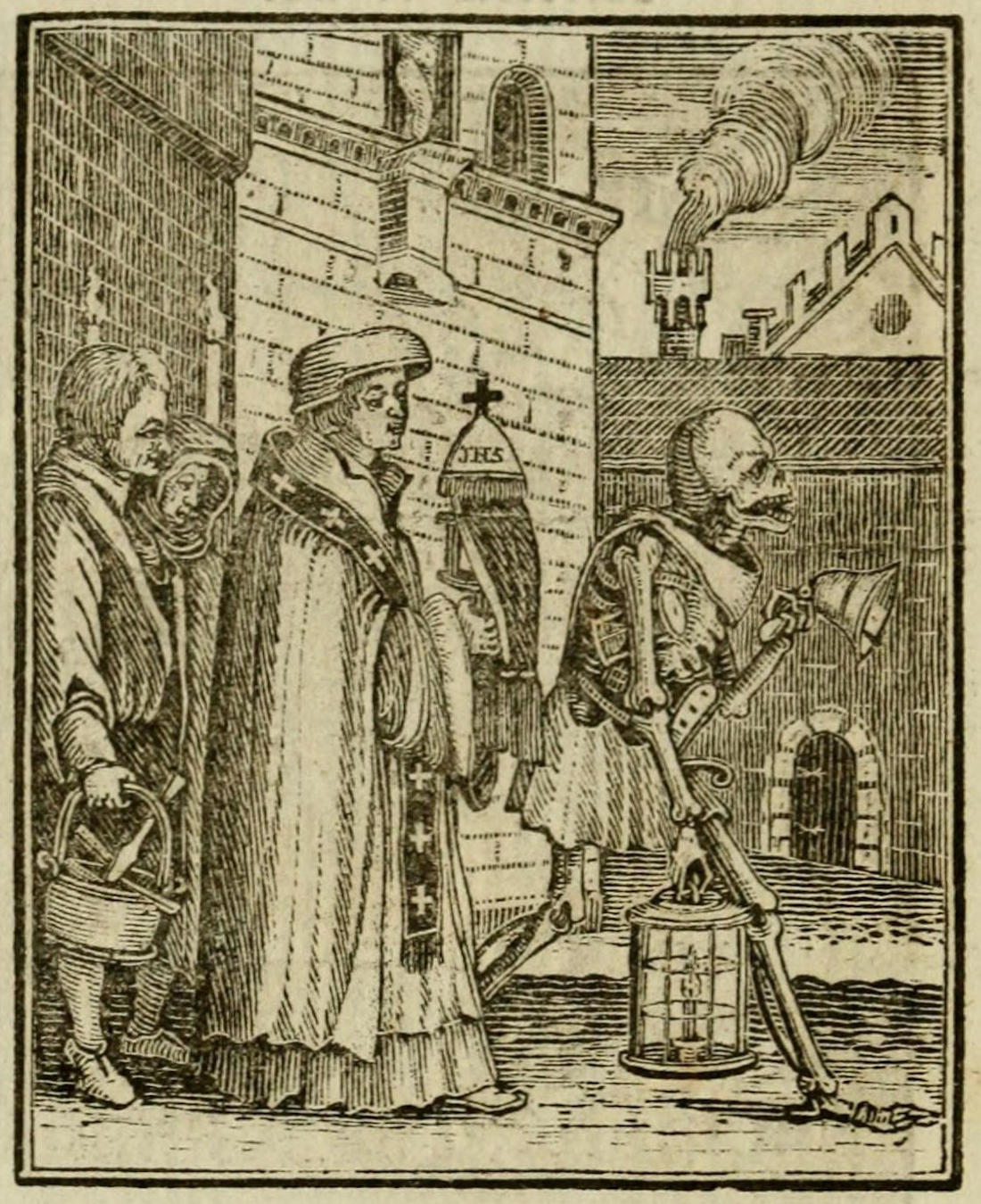 In Addition to this Instance we learn, that, in the Reign of Henry the Sixth, one Jenken Carpenter caused to be painted at his Expence on the Walls of the Cloister of St. Paul’s Cathedral, London[8], the Dance of Machabray, or Dance of Death[9]; and it is more than probable[x] that the celebrated Painting of the same Kind in St. Innocent’s Church, in Paris, in like Manner owes its Original to the Painting at Basil.