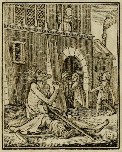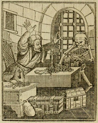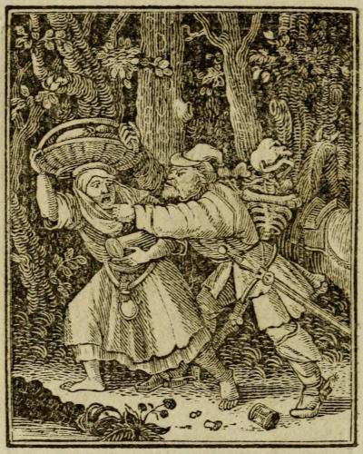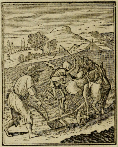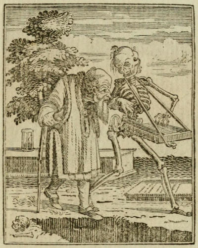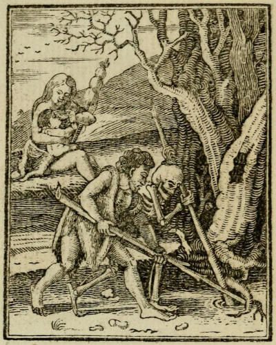 Having thus accounted for the Existence of the Book, and for its Arrival in France, it remains to speak of the several Impressions which it there underwent. We have already mentioned one, the earliest which we know of, printed in small Quarto, at Lyons, soulz l’Escu de Cologne, by Melchior and Gaspar Trechsel, in 1538: The Cuts in this Edition are forty-three in Number, and no more; and over each is, in Latin, a Passage from either the Old or New Testament or Apocrypha, which, in the present Publication, is given in English, from the Translation of the Bible now in use. Under the Cuts are four Lines in French Verse, the Substance of which has been preserved in all the Editions, whether they were in Latin, French, or Italian. This Edition, in order to make it of a tolerable Size (for the Cuts alone would have been too few to constitute a Volume) is accompanied[xvi] with several Tracts in French, which, as not relating to, or connected with, our present Subject, we here forbear to enumerate; but it is necessary, before we close our Account of this Edition of 1538, to remark, that it is preceded by a Dedication in French, to the very Reverend Abbess of the Religious Convent of St. Peter of Lyons, Madam Jehanne de Touszele; and in this Dedication the Author of it notices, that the Name and Surname (or, as we term them, the Christian and Surname) of the Abbess and himself are precisely the same in sound, excepting only the Letter T, from which I conjecture (for his Name does not any where appear) that his Name was Jean, or, as it was anciently written, Jehan [i. e. John] de Ouszell, or Ozell, as it is now usually spelt. In this Dedication is also a Passage, a Translation of which will be given hereafter, from which it appears that the Person by whom the Cuts were designed, was then dead, leaving behind him several others of the same Kind, which, though drawn, were unfinished, and particularly one representing a Waggoner crushed under his overthrown Waggon; in which Cut, a Figure of Death is represented secretly sucking through a Reed, the Wine out of a Cask; and that to these unfinished Cuts no one had dared to put the last Hand.