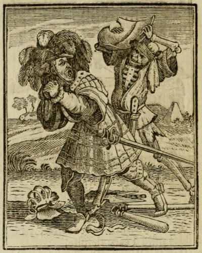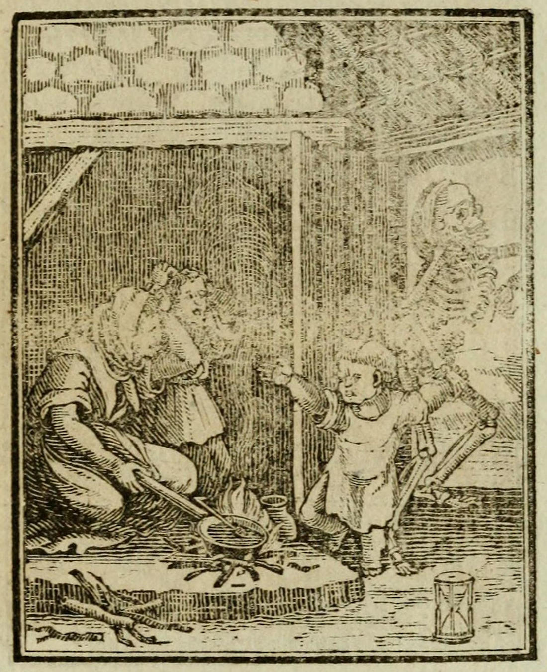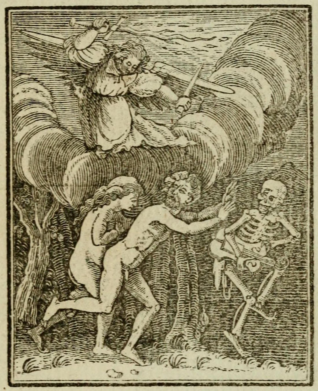 In 1547, another Edition was published of this Book, in French; it was entitled, “Les Images de la Mort,” and printed at Lyons, A l’Escu de Cologne, Chez Jehan Frellon; the Title-Page also informs us that twelve Cuts are added to it, and on Examination we find that the Cuts inserted in Page 40, and the seven subsequent Pages of this Work, and four Cuts of Boys, which, as not relating to this Subject, are in the present Edition omitted (none of which occur[xviii] in either the French Edition of 1538, or the Latin one of 1542, the only two prior Editions that I know of) are to be found in this of 1547[15].