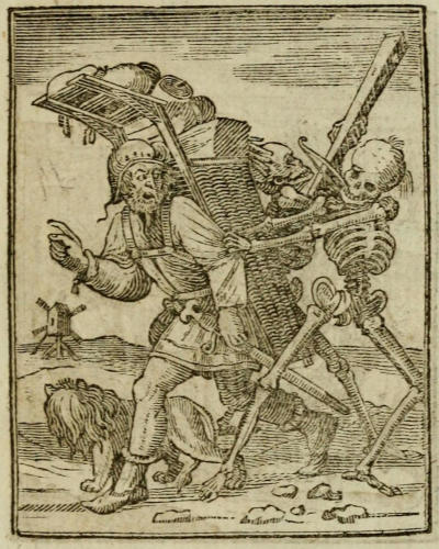 “But the most noted Thing in St. Mary’s Church is the Painting called Death’s Dance, so much talked of in all Parts of Germany. It was originally drawn in 1463, but the Figures were repaired at different Times, as in 1588, 1642, and last of all in 1701. Here you see the Representation of Death leading an Emperor in his imperial Robes, who with his other Hand[viii] takes hold of such another Figure, which leads up a King; and so alternately a Figure of Death and a human Person through all Conditions and Stages of Life. The Intention of the Artist was to shew that Death pays no Regard to Age or Condition, which is more particularly expressed in the Verses underneath. They were composed at first in Plat Deutch, or Low Dutch; but at the last Repair, in 1701, it was thought proper to change them for German Verses, which were written by Nathaniel Schlott, of Dantzick.” Of these Verses Dr. Nugent has inserted a Translation from the original German, by a Lady of Dantzick, from which it appears that the Originals consist of, first, an Apostrophe of Death to all, and then an Address of Death to one Individual; then follows his Reply; after that, Death’s Address to another; next, his Reply; and so on. It further appears from the Translation, that the Characters delineated in the Painting are the following: The Pope, Emperor, Empress, Cardinal, King, Bishop, General, Abbé, Knight, Carthusian, Burgomaster, Prebendary, Nobleman, Physician, Usurer, Chaplain, Steward, Church-Warden, Tradesman, Recluse, Peasant, Young Man, Maiden, Infant, Dancing-Master, and Fencing-Master.