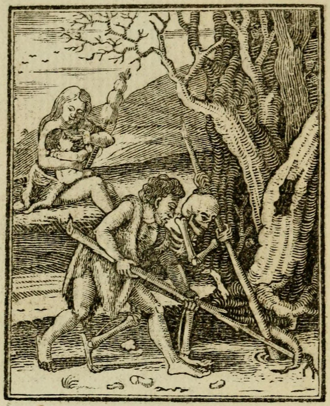 The earliest Edition of the Imagines Mortis which I have as yet seen, is one printed, as appears from the Colophon at the End, by Melchior and Gaspar Trechsel, in small 4to. at Lyons, in 1538: It is in French, and its Title is as follows: “Les Simulachres & Historiees faces de la Mort, autant elegamment pourtraictes, que artificiellement imaginees: A Lyons, soulz l’Escu de Cologne.” But Papillon, in Loco supra cit, tells us, that the Cuts to the Imagines Mortis must have been done about the Year 1530, for that the four first of them occur among Holbein’s Cuts to the Old Testament, printed in 1539; and that it is apparent from those among the Scripture Cuts, that the Blocks had then already furnished many Thousands of Impressions. That the four first Cuts of the Imagines Mortis are among the Scripture Cuts of Holbein, is certainly true; but I think I once saw, in the Hands of a Friend, a Copy of the vulgate Latin Bible, in which those Scripture Cuts were inserted, and which, if my Memory does not greatly deceive me, was printed so early as in or about 1518 or 1520.