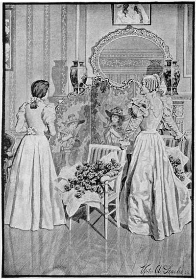 Isabelle was straining with clasped hands and parted lips, gazing amazedly upon a threefold[268] screen shielding the hearthplace. The panels bore each a female figure, but the central one was that which had engrossed the young artist’s attention to the exclusion of the others; and its design was a golden-haired child in a delicate drapery of heliotrope tint reaching upward to pull the bunches of wistaria blooms from a vine wreathed above her head. The scheme of the coloring, even to the framing of the screen, was of heliotrope and gold, and the effect was of indescribable light and joy.