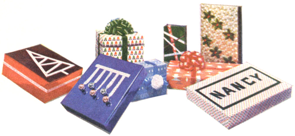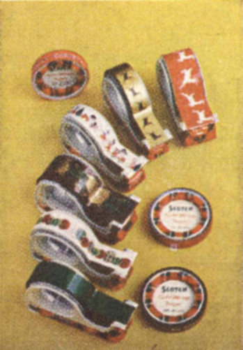 Gay-as-the-season effects come easy with happy-looking “Scotch” Gift Tapes—in many modern new patterns and solid tones. And these tape-touched gifts go through the mails with beauty unmarred.