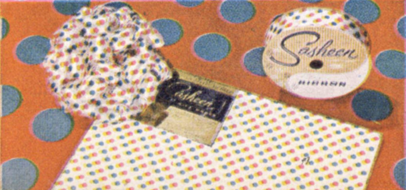 Gift wraps to make eyes dance—and all stemming from the basic “Magic Bow”. Only “Sasheen” brand Ribbon, with its special backing, makes possible these ingenious variations.