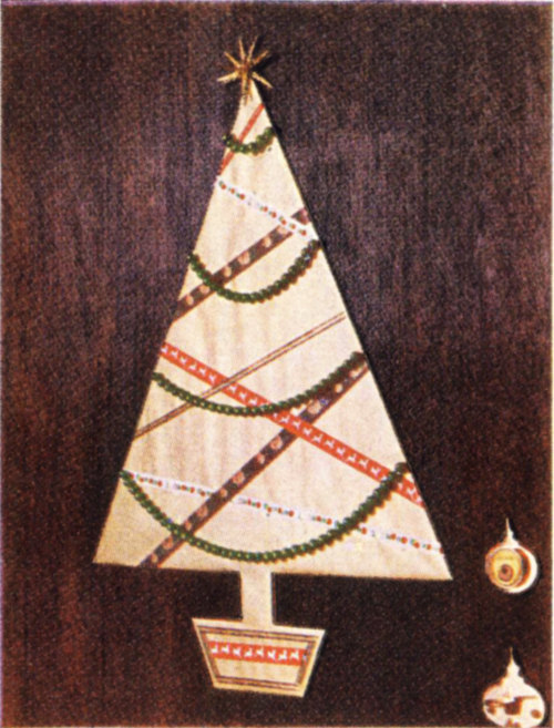 DOOR DECOR. Tape gift paper to tree-shaped cardboard. Add gift tapes to please. (Cover with plastic wrap for weather-proofing.) Tape on ornaments or rope beads.