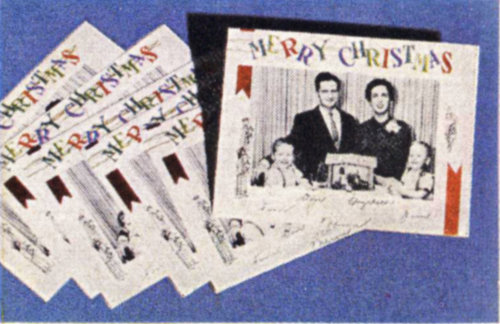 FAMILY GREETING CARDS. Give the warmth and quick color of “Scotch” Gift Tape in holiday designs to popular photographic greeting cards. Pretty, so personal.