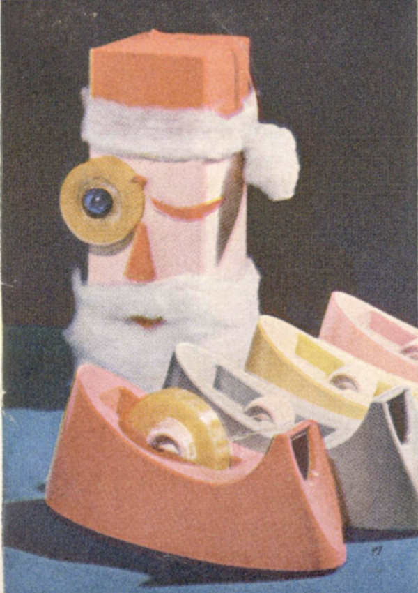 “FRIENDSHIP GIFT” IDEA—NEW DÉCOR DISPENSER, 98¢. Attractive way to keep “Scotch” brand Cellophane Tape always at hand in kitchen, den or family room. Four home-décor colors—non-slip bottom for dispensing tape with one-hand ease—scratchproof rubber-padded base. Tape not included, so try this wrapping idea: Add a 59¢ economy-size roll (4 times the tape of a 25¢ roll) as the eye of a gay “Santa” face—plus ornament for eyeball, shaped paper for wink, cotton for beard. Wonderful gift for friends, neighbors—or as a party prize.