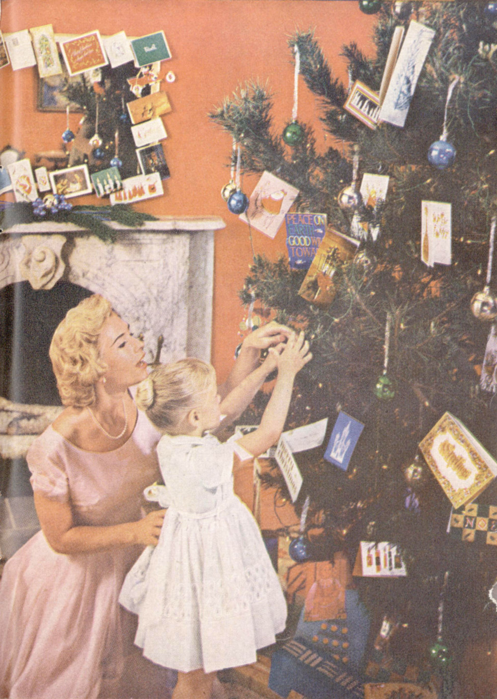Pretty way to decorate and please friends, too ... displaying their cards with the Christmas Magic touch of “Scotch” brand Cellophane Tape.