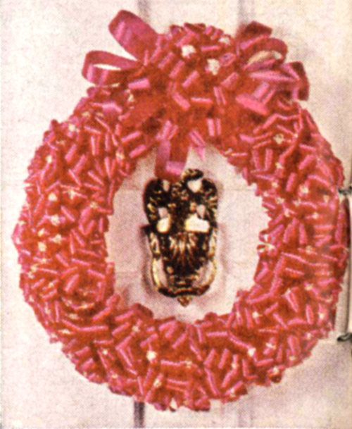DAZZLE WREATH. Front-door dress-up with Glitter Bows (or any “Sasheen” bow). Make “Magic Bows”. Then press loop ends together (a) and cut V-notches in as many loops as you like. Back cutouts with “Scotch” Cellophane Tape and sprinkle with glitter. Form a wire coat hanger into a circle and tape or tie on bows.