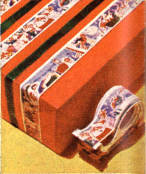 Fascinating peeking ... the clever, deceptively easy gift wraps possible when you team everyday objects with “Scotch” brand Cellophane Tape. It “sticks like crazy”!