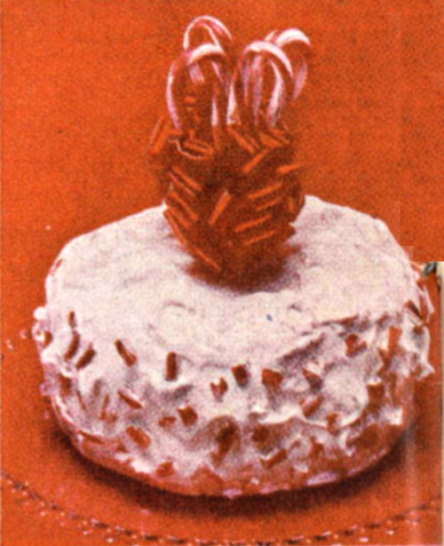 CENTERPIECE CAKE. Focal point of your festive holiday table ... this gay cake with Fluffy White Frosting. Make 2 “Magic Bows” of “Sasheen”. Tie a bow to each side of a cluster of four candy canes; tuck in center of cake. Dot sides with crumbled candy cane.