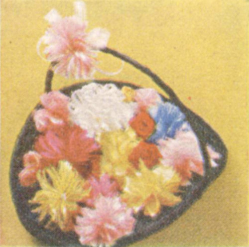 PINWHEEL BOW. A whirl of color here in lacy “Decorette.” Tie a pre-fab “Magic Bow” making only 6 or 7 turns for loop. Pull out all loops to one side (not left and right) and arrange (c).