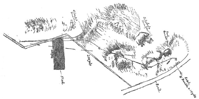 At the fourteenth hole at St. Andrews this tilt of the green has a considerable influence on the tee shot 530 yards away. Some years ago there were four of us playing four ball matches nearly every day for a month. We, according to our own judgment, attempted to play this hole in four different ways. A played his tee shot well away to the left of the Beardies on to the low ground below the Elysian Fields, so as to place his second in a favourable position for his approach. B, who was a long driver, attempted to carry the Beardies with his drive, Hell with his second, and run up his third.[106] C, who was a short but fairly accurate hitter, attempted to pinch the Beardies as near as he dare, and then played his second well away to the left, so as to play against the slope of the green for his third. D took what was apparently the straightforward route along the large broad plateau of the Elysian Fields, and eventually landed in Hell or Perdition every time: he invariably lost the hole.