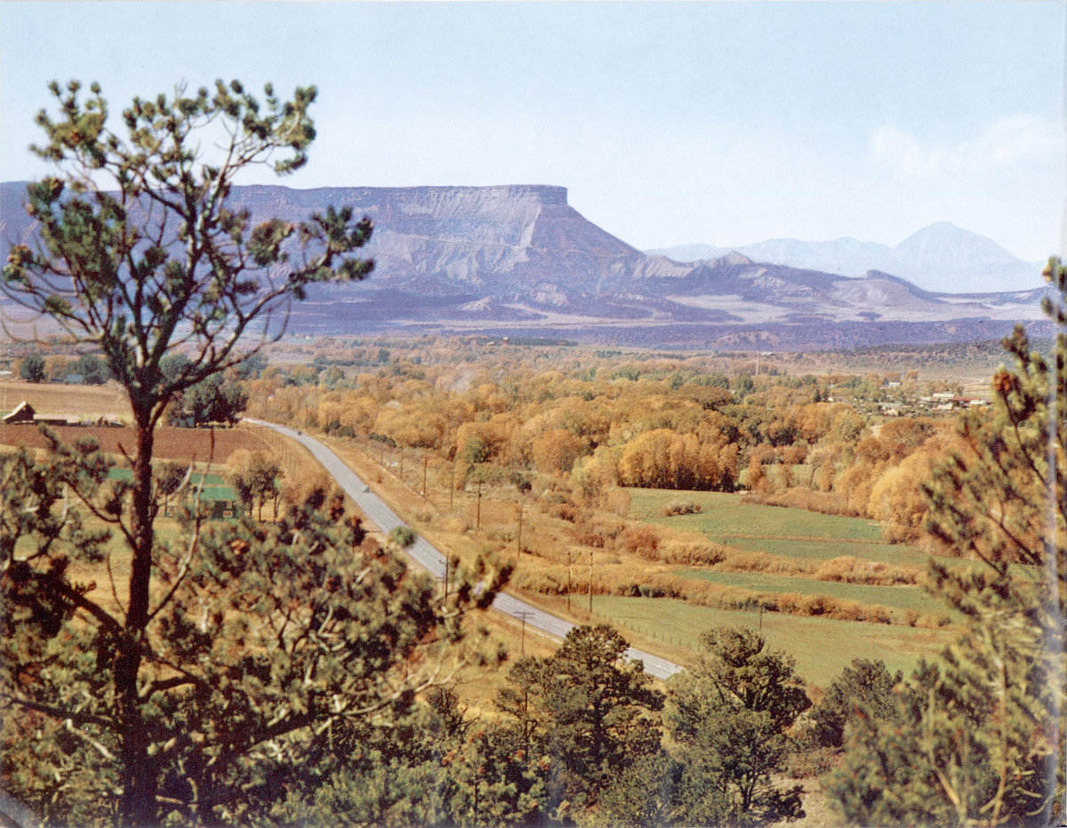 MESA VERDE—the “green tableland” rises 1,500 feet above the Mancos Valley, here seen in its colorful October foliage. In the foreground, Highway 160 bears westward to the pioneer town of Mancos, 1 mile distant, and to the Park Entrance, 8 miles farther, just below the distant bulk of Ute Mountain. Beneath the bold promontory of Point Lookout the Park Entrance Highway can be seen climbing to the top of Mesa Verde.