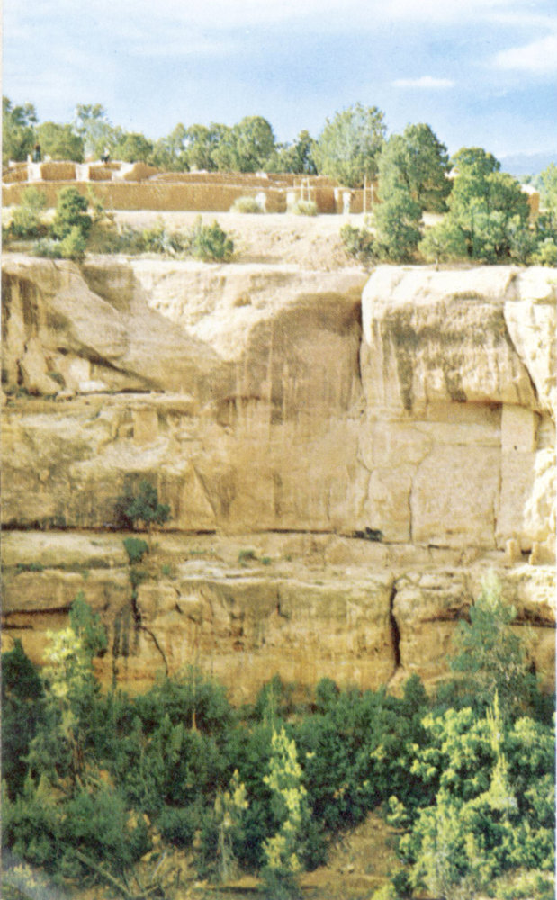 To enter this loop road you will bear right at the first junction beyond the Spruce Tree Museum Park lot. Stops at the sign, “Pit Houses,” and at four additional surface-ruin sites in the next two miles, enable you to look into homes of the pueblo farmers dating from 600 to approximately 1200 A.D. These exhibits warrant more than superficial study.