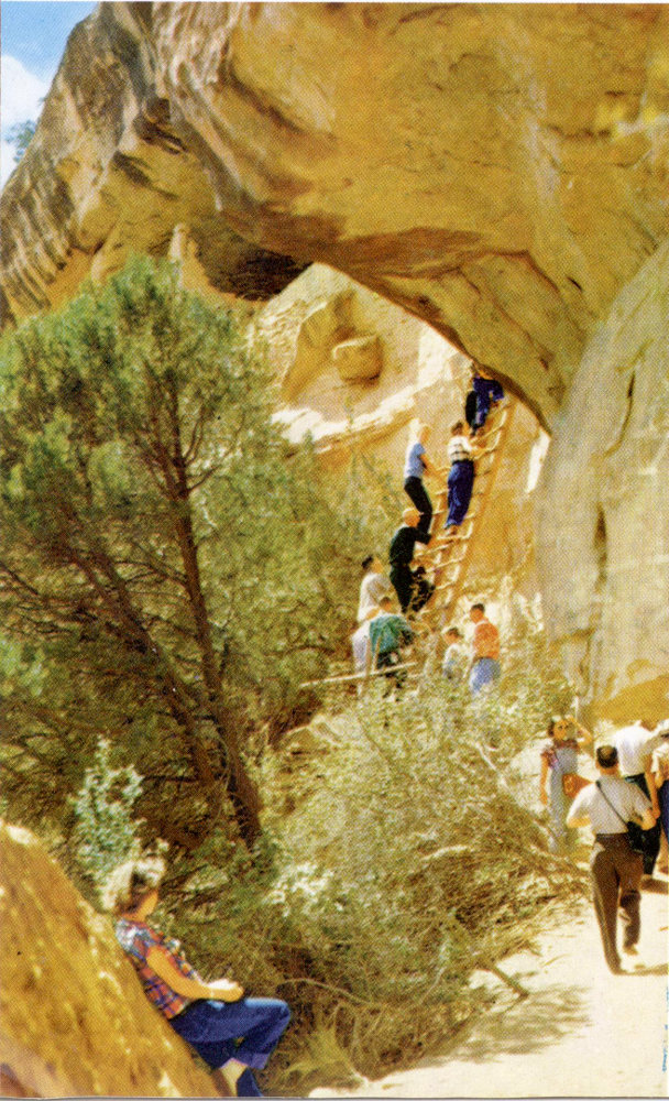 The trail trip through Cliff Palace ruin requires approximately three-quarters of an hour. Leave your car at the designated parking space. Walk first to the railed rock promontory about 100 feet from the road, from which point a splendid panorama view is obtained; then make the 5-minute descent down the foot trail to the Ruin where you will be met by the ranger-archaeologist.
