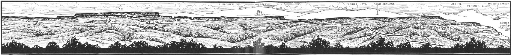 In many ways, the section of the panorama pictured in the above sketch is most significant: it looks southward and westward into the vast distances of the Navajo and Ute Indian Reservation—the “Four-Corners Country,” where sixty thousand Navajos herd their sheep and live their primitive nomadic life.