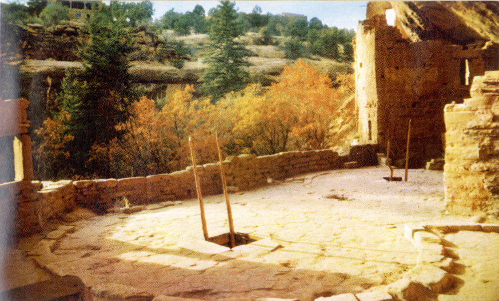 There are 23 kivas, circular underground ceremonial chambers, each of which was used by the men of an individual clan. When visiting ruins, note these features: fire pit, ventilator shaft, deflector, 6 pilasters, and the Sipapu (spiritous entrance to the underworld).