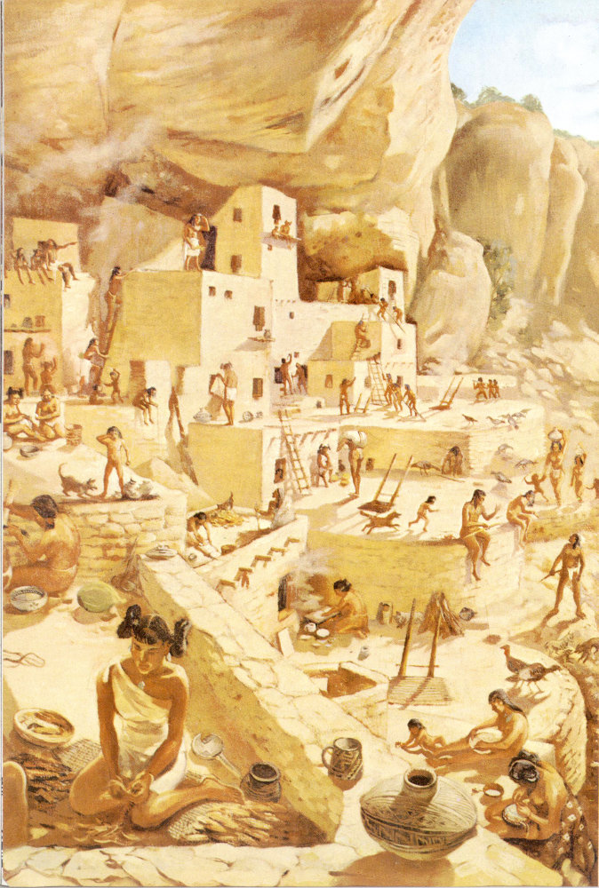 Collaborating with the staff of the Mesa Verde Museum, the artist has shown typical activities at 3:00 P.M. on a sunny autumn afternoon in 1270 A.D.