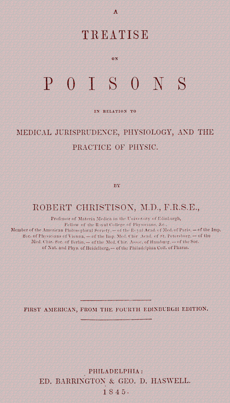 The author regrets that circumstances beyond his control have delayed the re-appearance of the present work beyond the period at which it was called for by the favourable reception of the last edition. He has endeavoured to take advantage of the numerous investigations which have been carried on during the interval into the several departments of Toxicology in the leading countries of Europe; and has in consequence been led to enlarge the work materially.