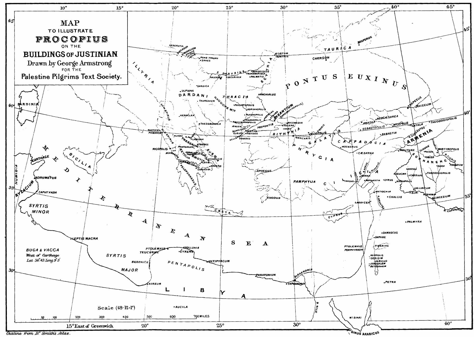 A plan of the remains of Taucra or Teuchira is given in Capt. Beechey’s ‘North Coast of Africa,’ p. 388 (4to., 1828). He states, p. 353, that the walls repaired under the Emperor Justinian still remain in a state of perfection which sufficiently proves the solidity of the work. A long account of the city and its walls is given at p. 375, etc. Also in Smith and Porcher’s ‘Discoveries at Cyrene’ (1864), p. 64, where Justinian’s walls are particularly mentioned.