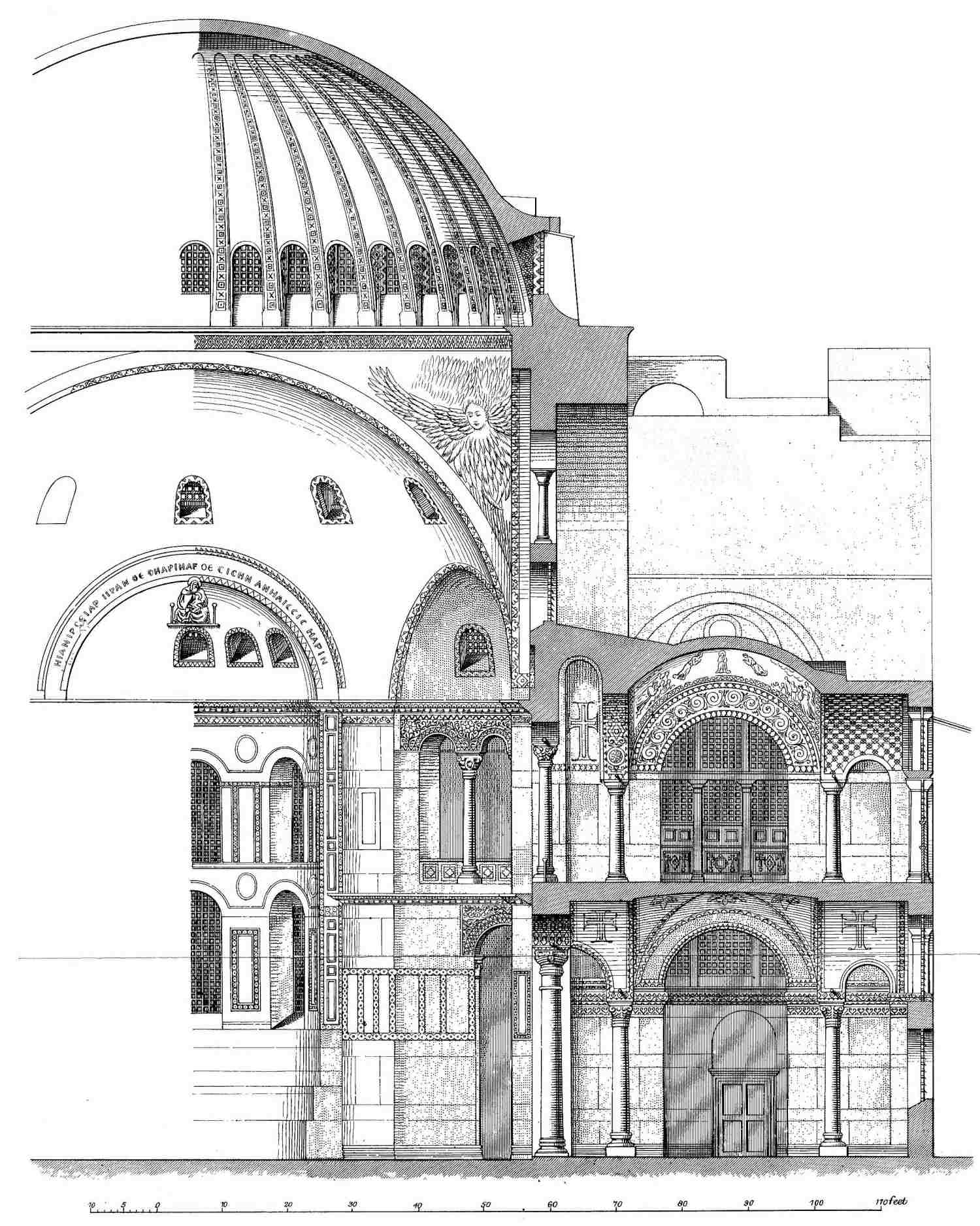 The church consequently presented a most glorious spectacle, extraordinary to those who beheld it, and altogether incredible to those who are told of it. In height it rises to the very heavens, and overtops the neighbouring buildings like a ship anchored among them: it rises above the rest of the city, which it adorns, while it forms a part of it, and it is one of its beauties that being a part of the city, and growing out of it, it stands so high above it, that from it the whole city can be beheld as from a watch-tower. Its length and breadth are so judiciously arranged that it appears to be both long and wide without being disproportioned. It is distinguished by indescribable beauty, for it excels both in its size and in the harmony of its proportion, having no part excessive and none deficient; being more magnificent than ordinary buildings, and much more elegant than those which are out of proportion. It is singularly full of light and sunshine; you would declare that the place is not lighted by the sun from without, but that the rays are produced within itself, such an abundance of light is poured into this church. Now the front of the church (that is to say the part towards the rising 7 sun, where the sacred mysteries are performed in honour of God) is built as follows. The building rises from the ground, not in a straight line, but set back somewhat obliquely, and retreating in the middle into the form of a half-circle, a form which those who are learned in these matters call semi-cylindrical, rising perpendicularly. The upper part of this work ends in the fourth part of a sphere, and above it another crescent-shaped structure is raised upon the adjacent parts of the building, admirable for its beauty, but causing terror by the apparent weakness of its construction; for it appears not to rest upon a secure foundation, but to hang dangerously over the heads of those within, although it is really supported with especial firmness and safety. On each side of these there are columns standing 8 upon the floor, which themselves also are not placed in a straight line, but arranged with an inward curve of semicircular shape, one beyond another, like the dancers in a chorus. These columns support above them a crescent-shaped structure. Opposite this east wall is built another wall containing the entrances, and upon either side of it also stand columns with stonework above them in a half-circle exactly like those previously described. In the midst of the church are four masses of stone called piers, two on the north and two on the south side, opposite and equal to one another, having four columns in the central space between each. These piers are composed of large stones fitted together, the stones being carefully selected and cleverly jointed into one another by the masons, reaching to a great height. Looking at them you would compare them to perpendicular cliffs. Upon these four arches rise in a quadrilateral form. The extremities of these arches join one another in pairs, and rest at their ends upon these piers, while the other part of them rise to a great height, and are suspended in the air. Two of these arches, that is, those towards the rising and the setting sun, are constructed over the empty air, but the remainder have under them some stonework, with small columns. Now above these arches is raised a circular building of a spherical form through which the light of day first shines; for the building, I imagine, overtops the whole country, and has small openings left on purpose, so that the places where these intervals in the construction occur may serve for conductors of light. Thus far I imagine the building is not incapable of being described, even by a weak and feeble tongue. As the arches are arranged in a quadrangular figure, the stonework between them takes the shape of a triangle; the lower angle of each triangle, 9 being compressed between the shoulders of the arches, is slender, while the upper part becomes wider as it rises in the space between them, and ends against the circle which rises from thence, forming there its remaining angles. A spherical-shaped dome standing upon this circle makes it exceedingly beautiful; from the lightness of the building it does not appear to rest upon a solid foundation, but to cover the place beneath as though it were suspended from heaven by the fabled golden chain. All these parts surprisingly joined to one another in the air, suspended one from another, and resting only on that which is next to them, form the work into one admirably harmonious whole, which spectators do not care to dwell upon for long in the mass, as each individual part attracts the eye and turns it to itself. The sight causes men to constantly change their point of view, and the spectator can nowhere point to any part which he admires more than the rest, but having viewed the art which appears everywhere, men contract their eyebrows as they look at each point, and are unable to comprehend such workmanship, but always depart thence stupified through their incapacity to comprehend it. So much for this.