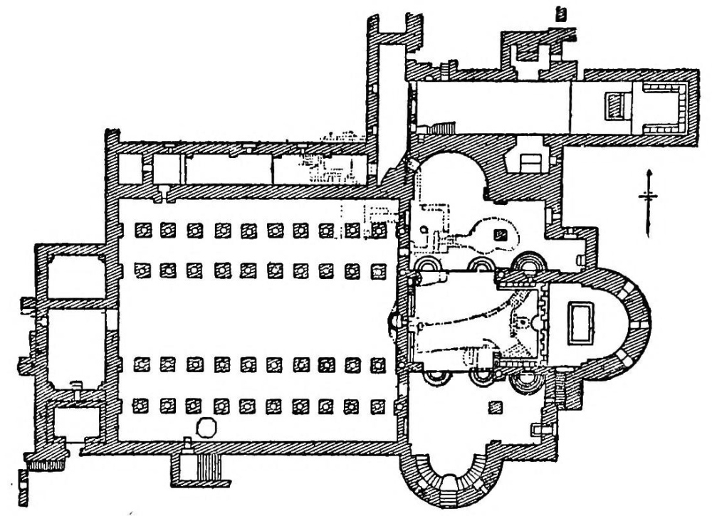 At the east end is a transept with north and south apses and an east apse of equal size. The floor of the transept is raised for a width equal to that of the basilica nave (35 feet). The basilica is separated by a wall, erected by the Greeks in 1842, from the transept.—‘Palestine Exploration Memoirs,’ vol. iii., pp. 83-85.