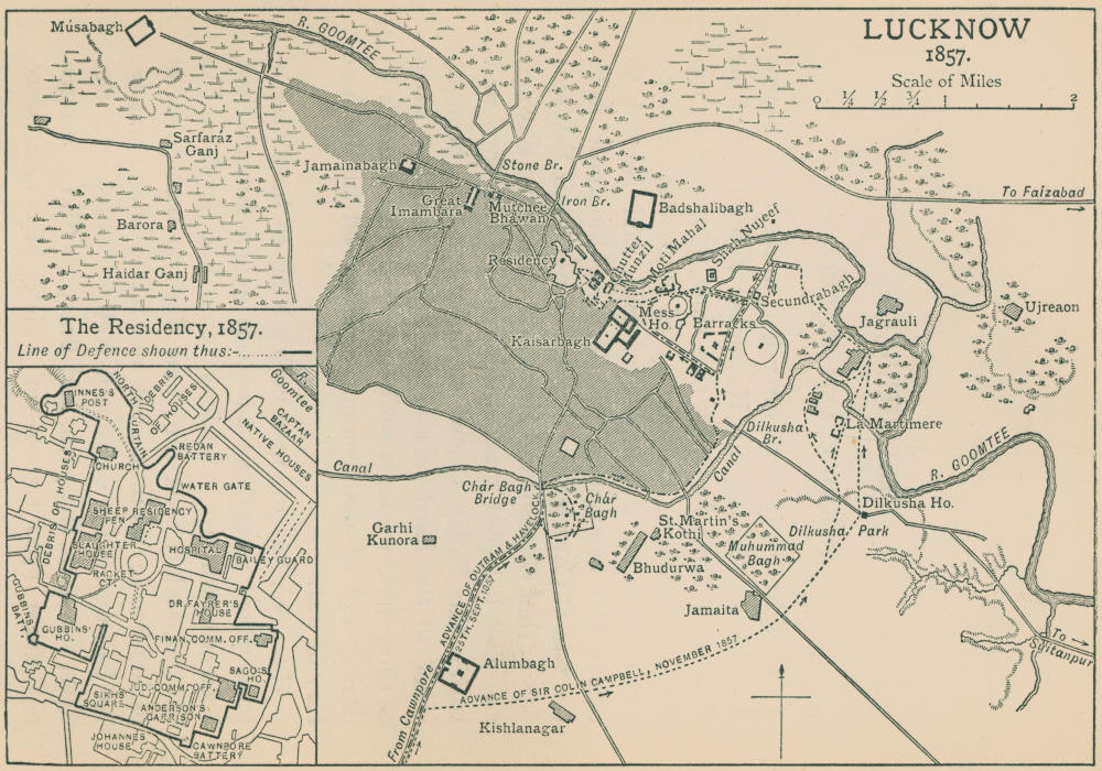 The outbreak was thus, at the beginning, a purely military mutiny; but its complexion and character[11] later on were affected by local circumstances. In Oude, for example, the Mutiny was welcomed, as it seemed to offer those dispossessed by the recent annexation, a chance of revenge. At Delhi it found a centre in the old king’s palace, an inspiration in Mohammedan fanaticism, and a nominal leader in the representative of the old Mogul dynasty. So the Mutiny grew into a new struggle for empire on the part of some of the Mohammedan princes.