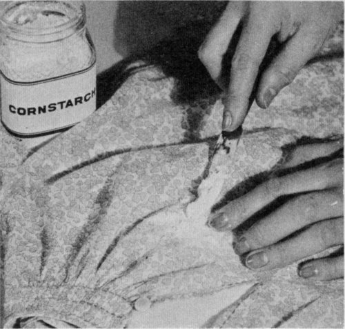 Absorbents.—Absorbent powders are particularly good for splatters of salad oil. Dust cornstarch or talcum powder over the spot, allow it to absorb the oil or grease, then brush off. Or make a thick paste by mixing the powder with carbon tetrachloride or other grease solvent, spread it on the spot, let dry, and brush off. Repeat if necessary. Another method is to put the stained cloth between cleansing tissues and press with a warm iron.
