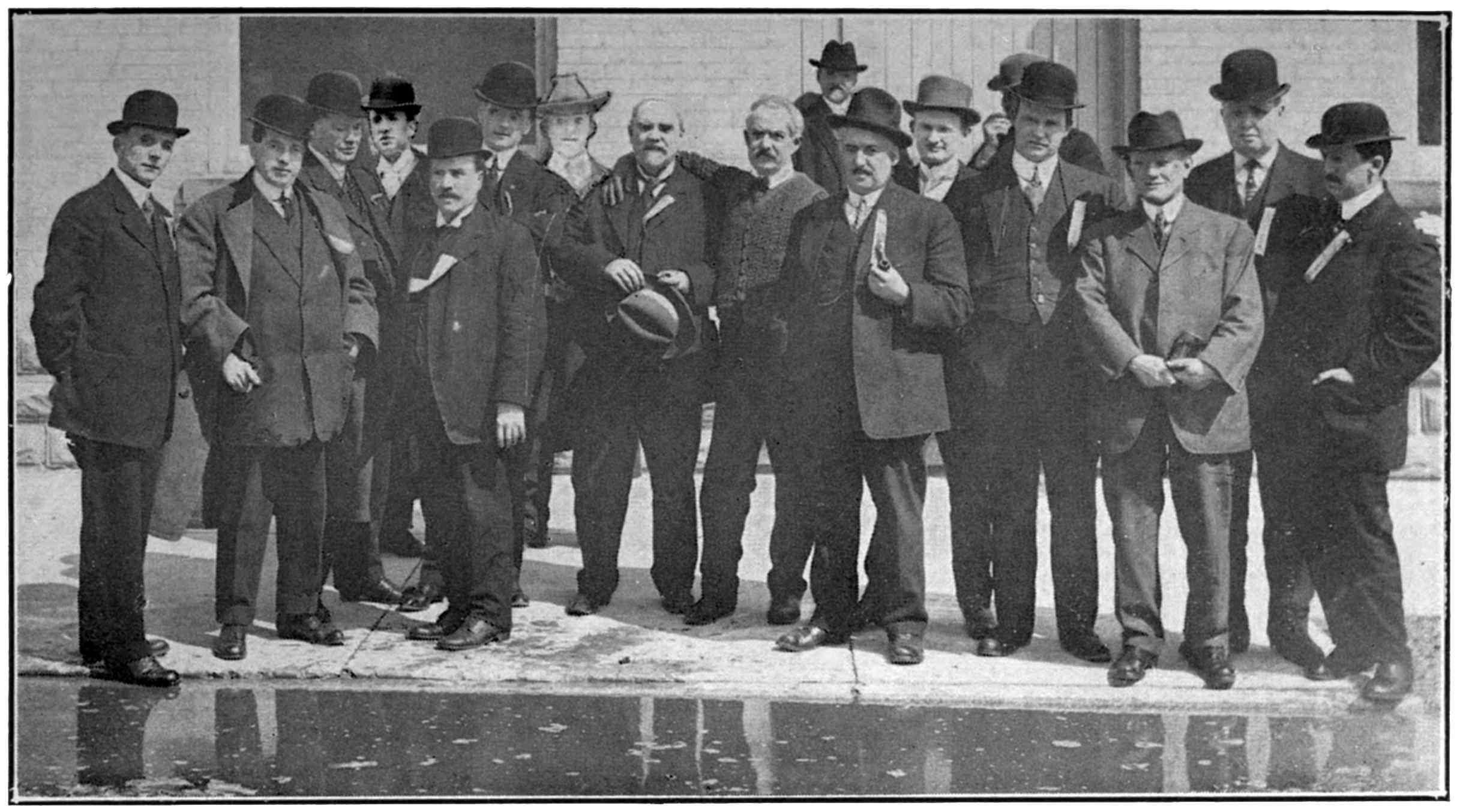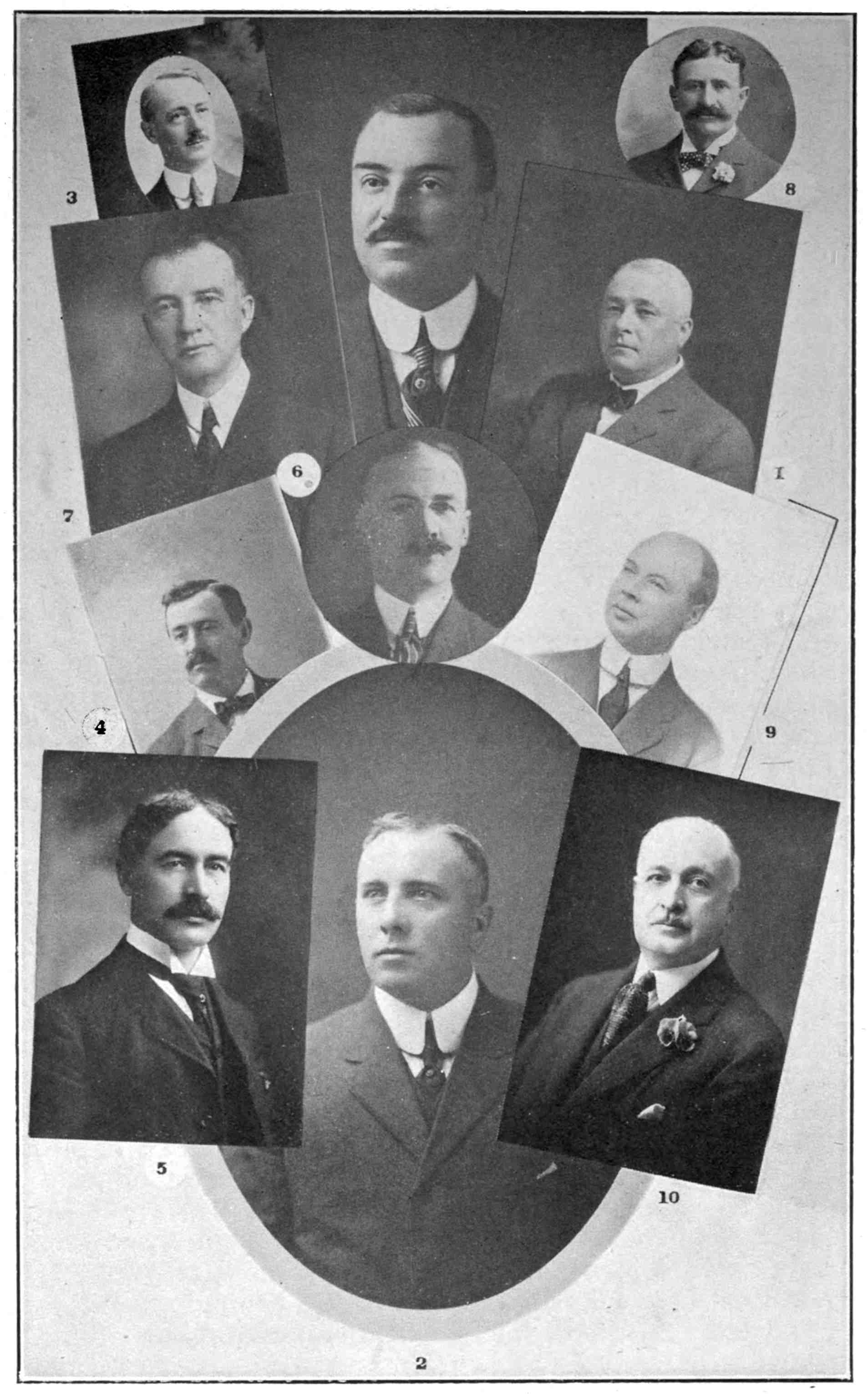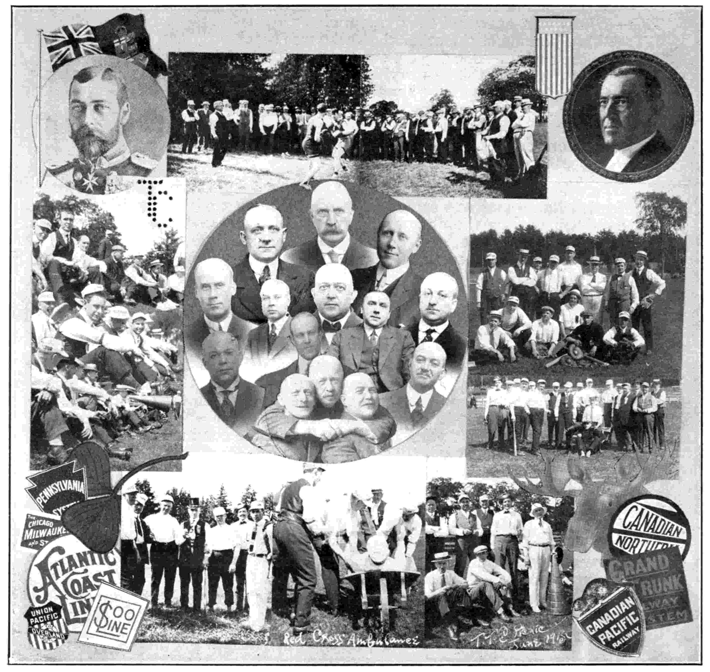 Top rows—W. J. Moffatt, C.P.A., Toronto; L. L. Grabill, Asst. Gen. Bge. Agt., Toronto; M. O. Dafoe, C.P. & T.A., Montreal; J. E. Quick, Gen’l Baggage Agent; F. P. Walsh, G. M., Crosby Tpn. Co., Milwaukee; C. P. Orttenburger, C.P.A., Chicago; J. P. Shea, T.P.A., Boston; A. A. Gardiner, G.C., Montreal.
