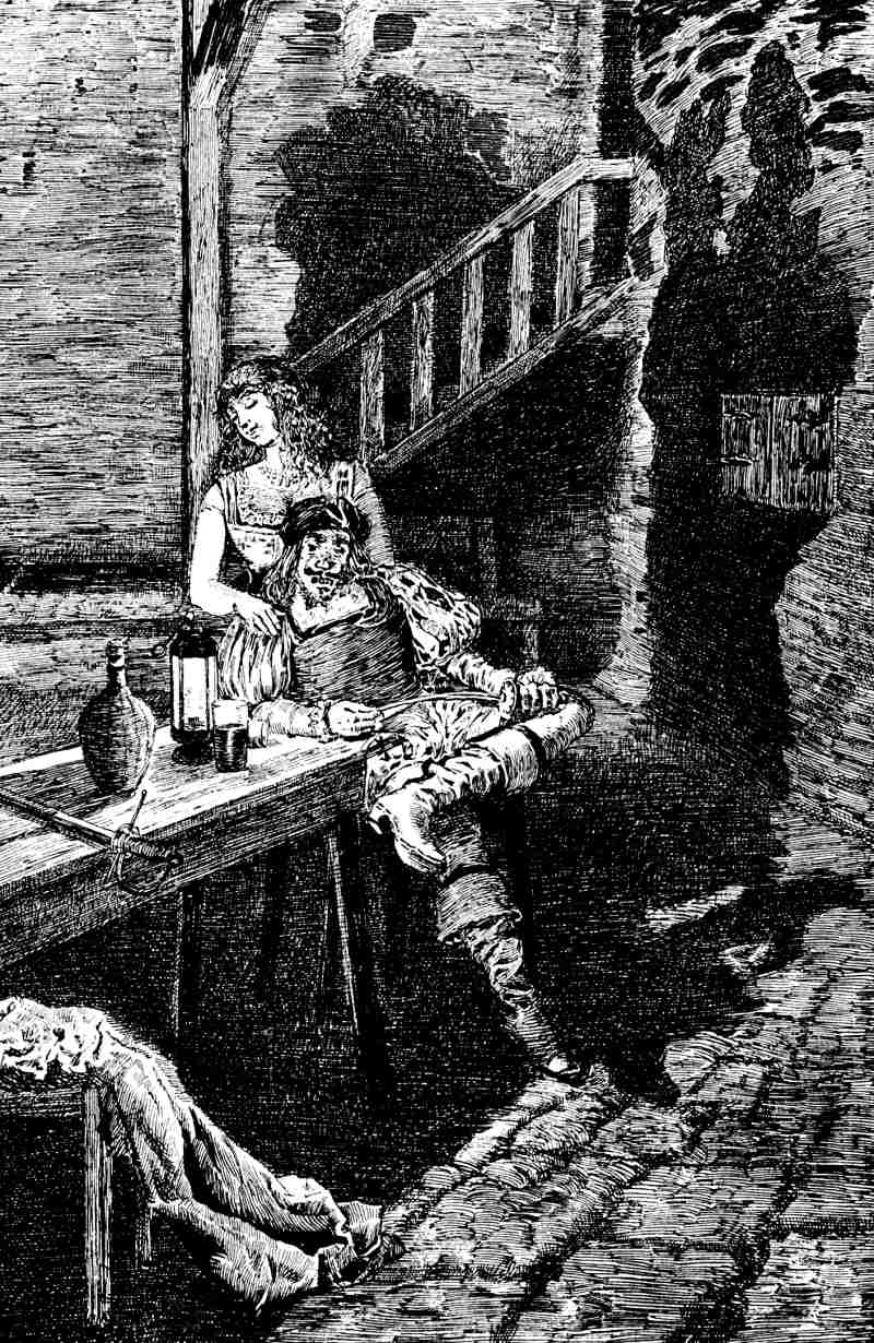 p. 365(Otberto deja caer el puñal. Job se levanta y contempla á Barbaroja. Guanhumara desde un pilar del fondo á la izquierda, observa en acecho.)