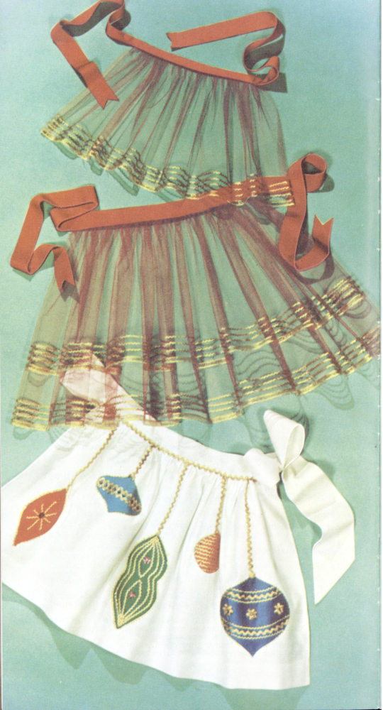 2. Stitch baby rick rack around edges of ornaments on right side having points even with raw edge. Press rick rack under at stitched line. Top stitch to apron with rick rack points showing, positioning ornaments as shown.