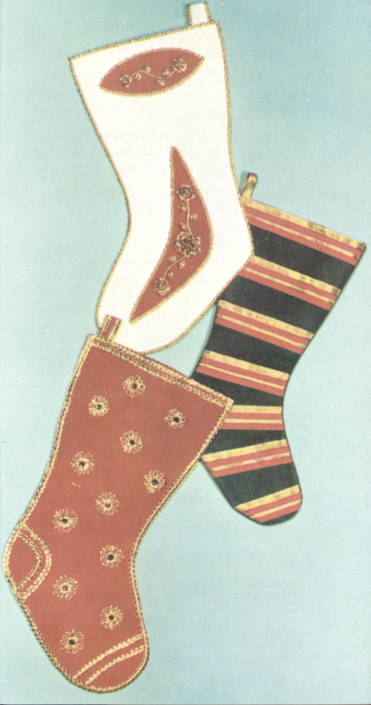 2. On front glue row of braid ½″ from top edge and across tip to form toe outline of stocking. Glue braid around entire outer edge of stocking.