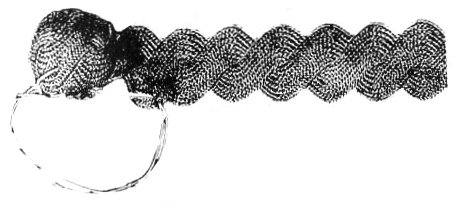 1. Cut strip of net 18″ x 72″. Stitch row of Loop Braid along bottom edge, then 3 rows of baby rick racks paced ½″ apart above braid. Repeat border 2½″ above.
