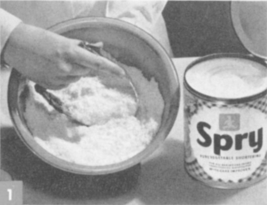 Mix 1 cup sifted all-purpose flour and ½ teaspoon salt. Measure ⅓ cup Spry.