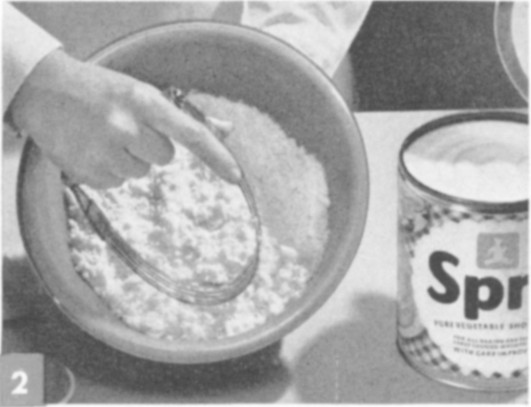 Cut ⅔ of the Spry into flour with pastry blender until as fine as meal. Be sure all the flour is mixed with the Spry. This step insures tenderness in the pastry.