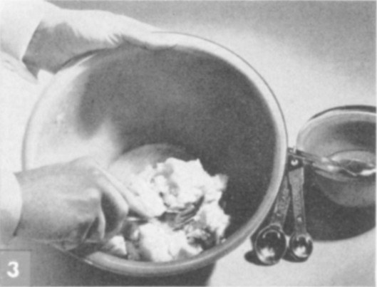 Sprinkle water over mixture; mix thoroughly with fork until all particles cling together. Take up in hands. Work into a smooth, well-blended ball of dough.