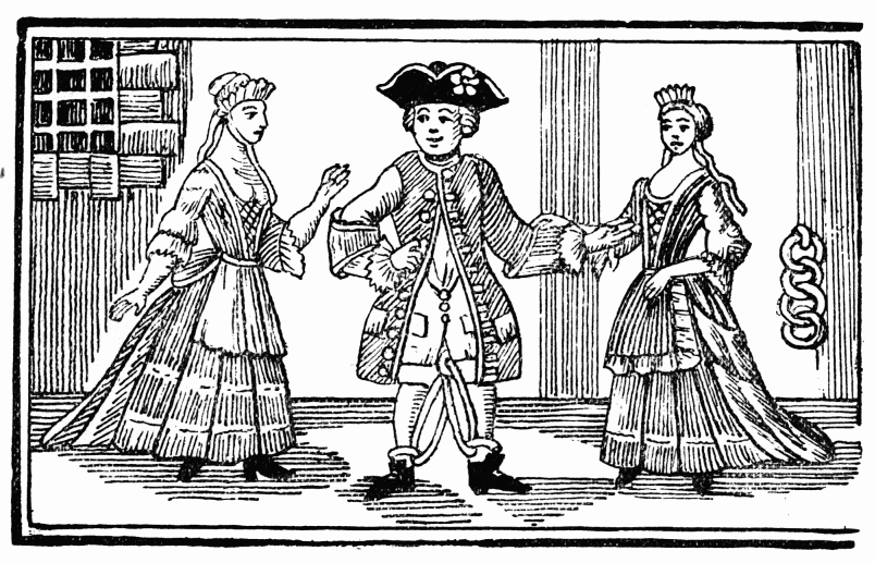 The illustration to this ballad has evidently done duty for a portion (most probably Macheath’s song of “How happy could I be with either”) of the “Beggar’s Opera,” first played at Lincoln’s Inn Fields Theatre, 1728. The Commode, or cap, of the ladies is that of the reign of Queen Anne; but it is probable that highwaymen’s female friends did not dress in the height of the fashion.