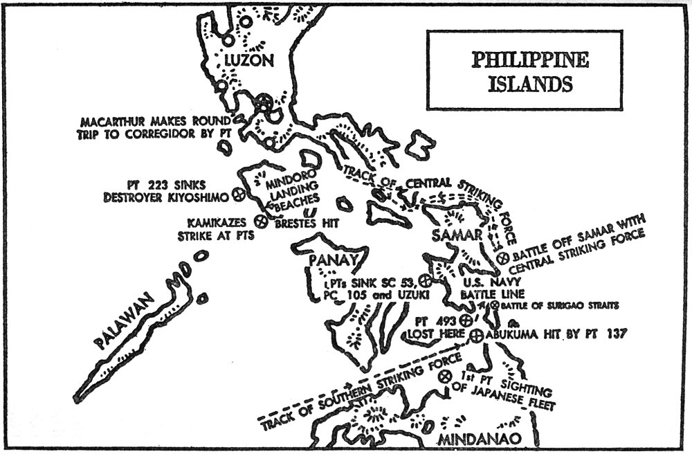 Admiral Kimura left Indo-China with a heavy cruiser, a light cruiser, and four destroyers, on a mission of bombarding the Mindoro beachhead. It wasn’t much of a naval task force to send into those waters, but as it happens, every American capital ship in the area was at Leyte, too far off to help. The only naval forces handy were the PTs.