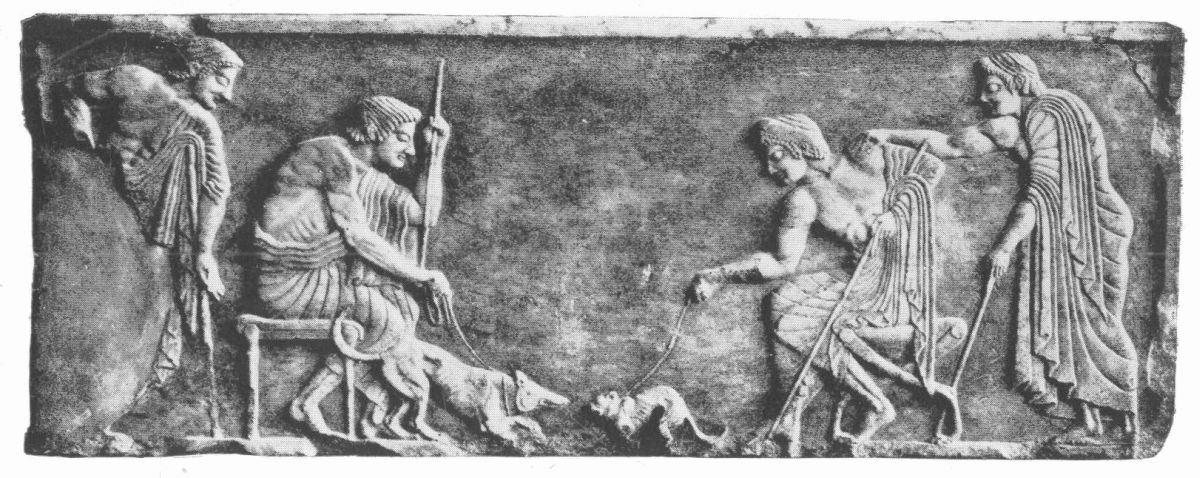 Of the actual details of these ball games we have very few accounts in literature or representations in art. One of the most recent archæological discoveries has, however, thrown light on one point. Up till lately we had no instance of implements being used; but in February, 1922, while the foundations of a shop were being constructed at Athens, sections of the Themistoclean circuit wall were brought to light. Built into them were three quadrangular bases of Pentelic marble with sculptured reliefs on their sides and one of these reliefs shows clearly the details of a hockey match. The ball is on the ground in the exact middle: two youths with sticks are engaged in a ‘bully’ for it precisely in the modern fashion: on either side of them stand two other pairs of youths, with sticks, representing, it may be presumed, the rest of the two competing teams.