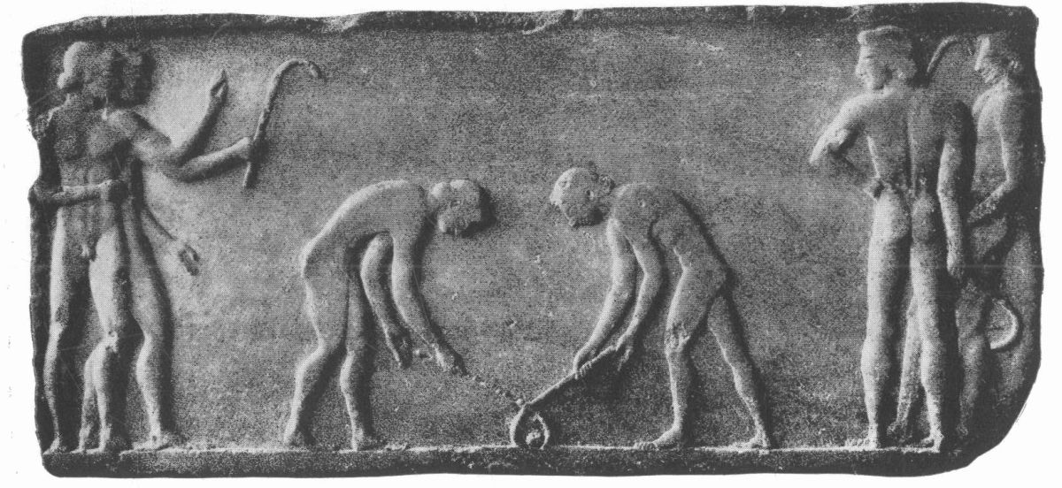 Another of the six reliefs, equally interesting, shows probably the beginning of the most popular{110} and the most energetic of all forms of ball games, the Phæninda, played with a small hard ball stuffed with hair, the Harpastum. The game bore some resemblance to our Rugby, except that the ball was always thrown and never kicked. The scene on the relief represents a throw-in from the touchline; one youth is preparing to throw, the rest are waiting either to seize the ball in the air or to tackle the next possessor. A passage from the comedian Antiphanes, quoted by Athenæus (Bk. I, ch. 26), gives a lively picture: