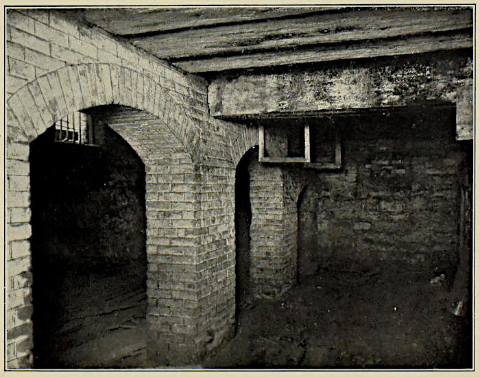 SHOWING PRESS SUPPORTS AND HAMMERED ONE INCH SQUARE IRON WINDOW BARS. TIMBERS AVERAGE 12 INCHES SQUARE. CUT SHOWS NEARLY ONE HALF OF BASEMENT.
