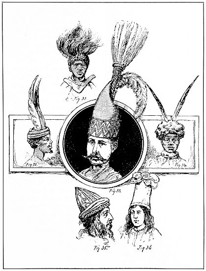 On page 11 we have some types of African head-dress, Figs. 31, 32 and 34 showing what the natives of that dark continent have done for themselves in the way of head adornment, entirely unaided by fashion or the knowledge of what their brothers in other parts of the world were wearing. Fig. 33, though of Asiatic origin and finer workmanship, is quite as grotesque in design as anything the wild tribes of Africa could devise.