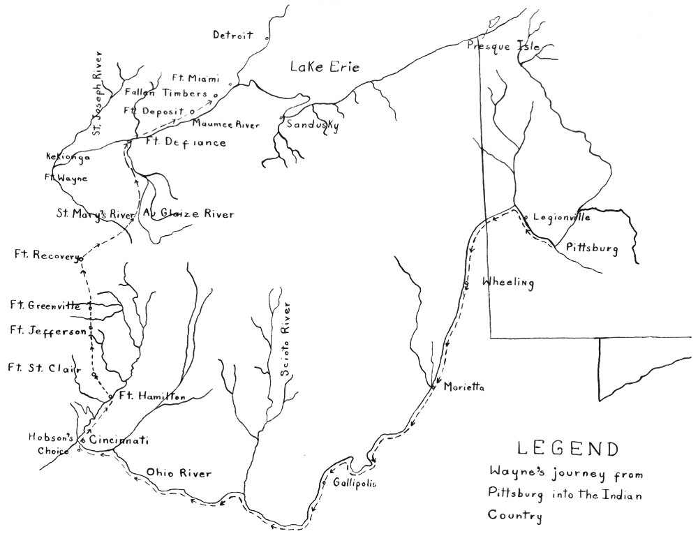 General Wayne proceeded westward toward Pittsburgh in the spring and summer of 1792. There he was commissioned to recruit and organize an American army. Some twenty-three miles from Pittsburgh at Legionville he drilled his forces and taught them the use of the sabre, pistol, bayonet, and espontoon. On April 30, 1793, his army embarked down the Ohio for Fort Washington, now Cincinnati, where they arrived on May 8, 1793. Outside that village of 1,100 persons he established headquarters at a point which he called Hobson’s Choice.
