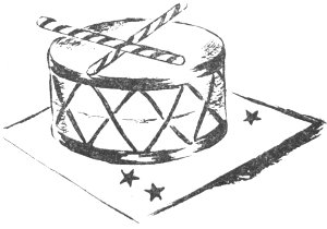 Drum Cake Centerpiece—Make 2 or 3-layer chocolate cake. Frost with white icing. When icing is set, melt chocolate over warm water and with paint brush paint rim on cake as pictured to simulate rim and lacings of drum. Use peppermint sticks as drumsticks. Place cake on wax paper, then on red or white paper sprinkled with stars.