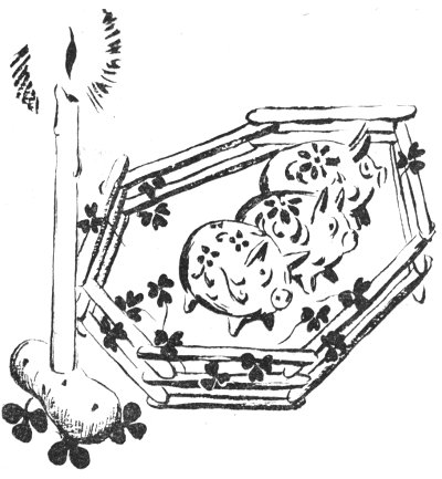 Make pig pen of bread sticks or long peppermint sticks as pictured. Sprinkle small paper shamrocks or small candy shamrocks in and around pen. Place pig banks in pen. For candleholder, cut out large potato and insert candle.